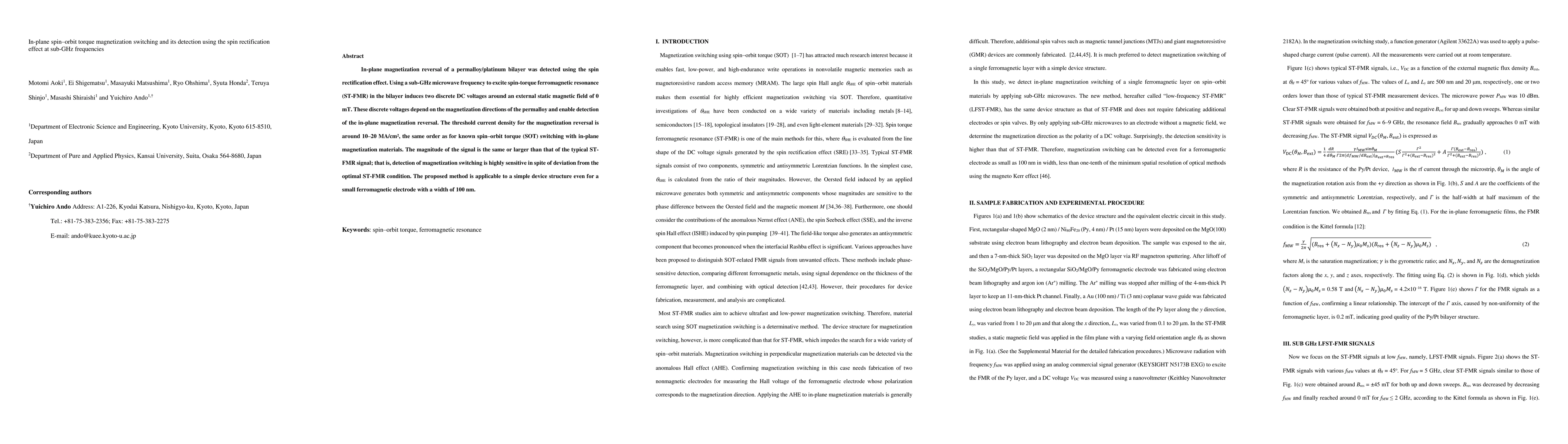 Inplane magnetization reversal of a permalloy/platinum bilayer was detected using the spin rectification effect. Using a sub GHz microwave frequency to excite spin torque ferromagnetic resonance (ST FMR) in the bilayer induces two discrete DC voltages around an external static magnetic field of 0 mT. These discrete voltages depend on the magnetization directions of the permalloy and enable detection of the inplane magnetization reversal. The threshold current density for the magnetization reversal is from 10 to 20 MA/cm^2, the same order as for known spin orbit torque (SOT) switching with in-plane magnetization materials. The magnitude of the signal is the same or larger than that of the typical ST FMR signal; that is, detection of magnetization switching is highly sensitive in spite of deviation from the optimal ST-FMR condition. The proposed method is applicable to a simple device structure even for a small ferromagnetic electrode with a width of 100 nm.