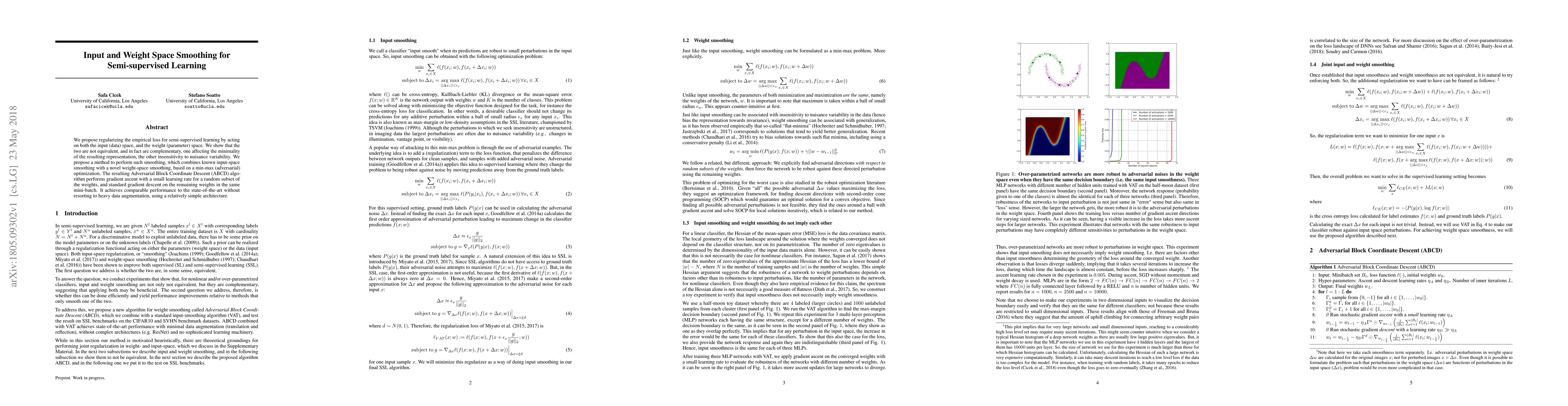 We propose regularizing the empirical loss for semi-supervised learning by acting on both the input (data) space, and the weight (parameter) space. We show that the two are not equivalent, and in fact are complementary, one affecting the minimality of the resulting representation, the other insensitivity to nuisance variability. We propose a method to perform such smoothing, which combines known input-space smoothing with a novel weight-space smoothing, based on a min-max (adversarial) optimization. The resulting Adversarial Block Coordinate Descent (ABCD) algorithm performs gradient ascent with a small learning rate for a random subset of the weights, and standard gradient descent on the remaining weights in the same mini-batch. It achieves comparable performance to the state-of-the-art without resorting to heavy data augmentation, using a relatively simple architecture.