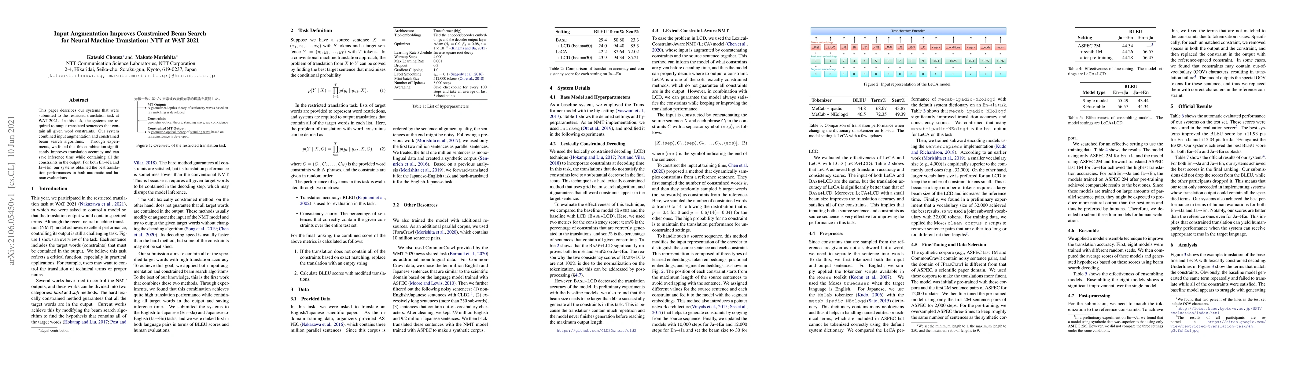 This paper describes our systems that were submitted to the restricted translation task at WAT 2021. In this task, the systems are required to output translated sentences that contain all given word constraints. Our system combined input augmentation and constrained beam search algorithms. Through experiments, we found that this combination significantly improves translation accuracy and can save inference time while containing all the constraints in the output. For both En->Ja and Ja->En, our systems obtained the best evaluation performances in automatic evaluation.