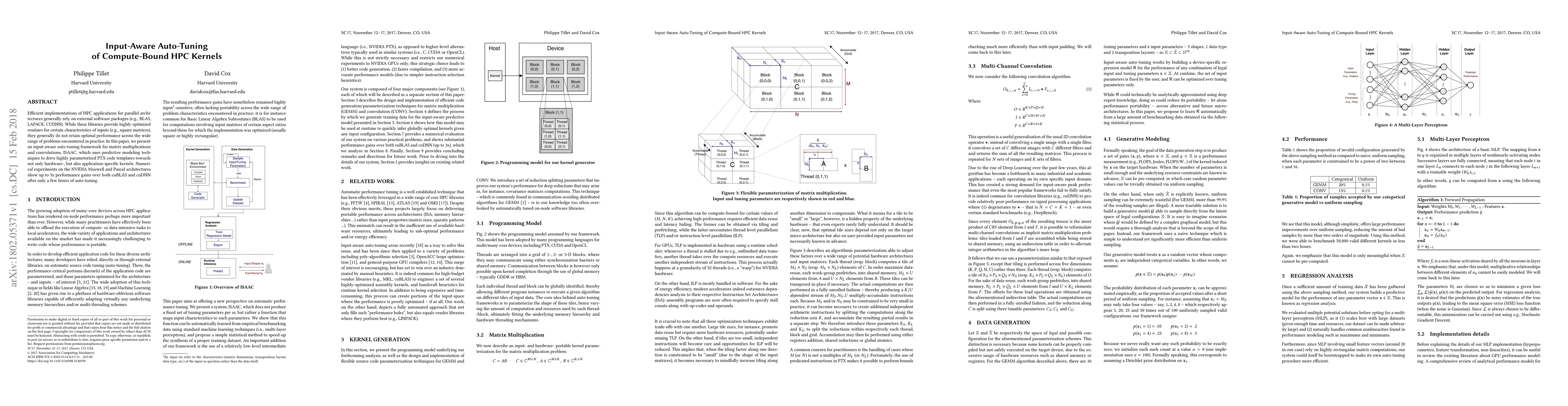 The paper presents ISAAC, an input-aware auto-tuning framework for matrix multiplications and convolutions, utilizing predictive modeling techniques to optimize highly parameterized PTX code templates for hardware- and application-specific kernels.