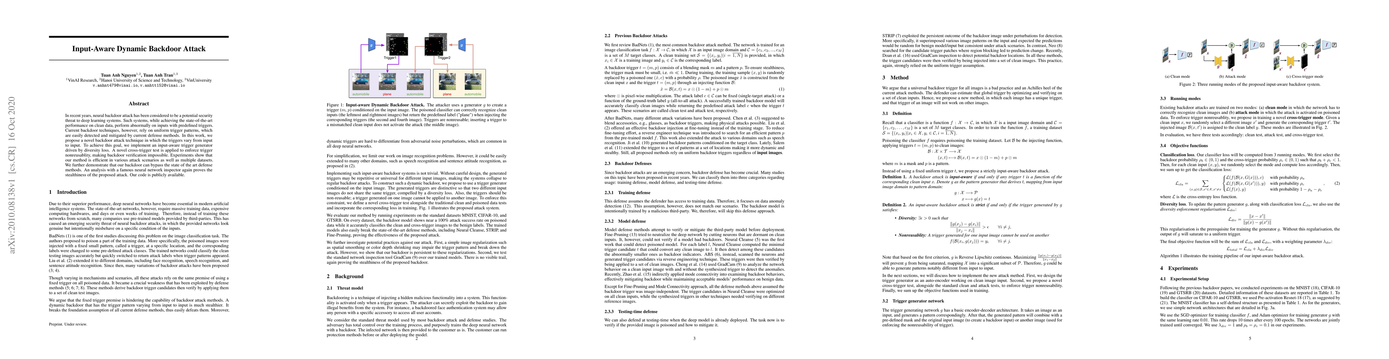 This paper introduces an innovative input-aware dynamic backdoor attack that varies triggers across inputs, evading detection by current defense methods. The proposed method employs an input-aware trigger generator and a cross-trigger test, demonstrating effectiveness across multiple datasets and outperforming state-of-the-art defenses.