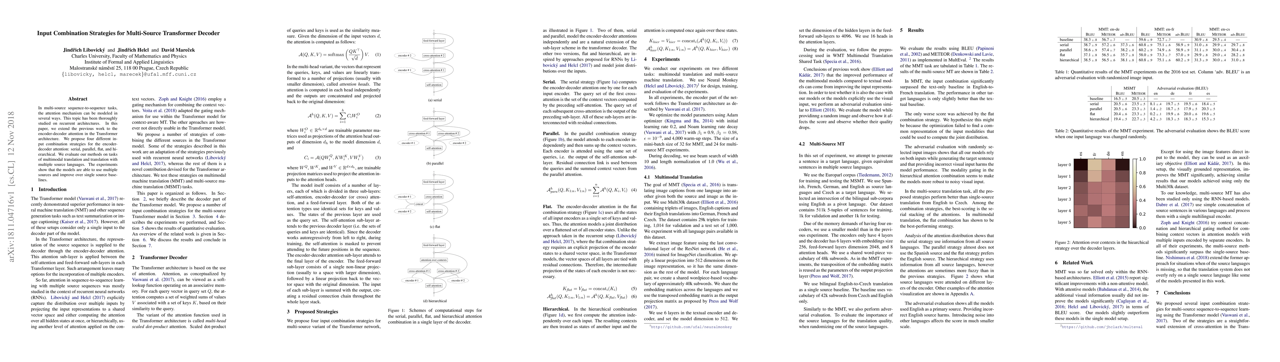 In multi-source sequence-to-sequence tasks, the attention mechanism can be modeled in several ways. This topic has been thoroughly studied on recurrent architectures. In this paper, we extend the previous work to the encoder-decoder attention in the Transformer architecture. We propose four different input combination strategies for the encoder-decoder attention: serial, parallel, flat, and hierarchical. We evaluate our methods on tasks of multimodal translation and translation with multiple source languages. The experiments show that the models are able to use multiple sources and improve over single source baselines.
