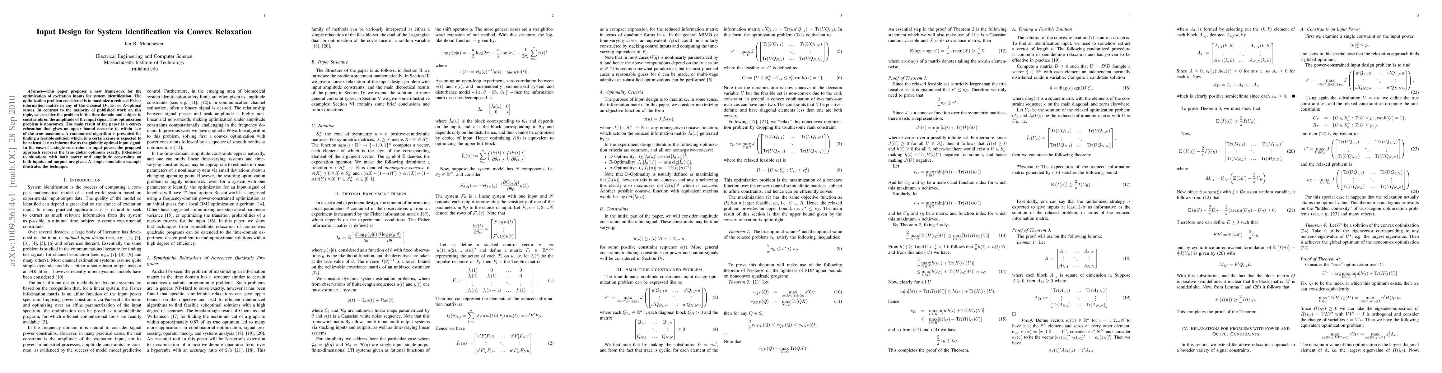 This paper proposes a new framework for the optimization of excitation inputs for system identification. The optimization problem considered is to maximize a reduced Fisher information matrix in any of the classical D-, E-, or A-optimal senses. In contrast to the majority of published work on this topic, we consider the problem in the time domain and subject to constraints on the amplitude of the input signal. This optimization problem is nonconvex. The main result of the paper is a convex relaxation that gives an upper bound accurate to within $2/\pi$ of the true maximum. A randomized algorithm is presented for finding a feasible solution which, in a certain sense is expected to be at least $2/\pi$ as informative as the globally optimal input signal. In the case of a single constraint on input power, the proposed approach recovers the true global optimum exactly. Extensions to situations with both power and amplitude constraints on both inputs and outputs are given. A simple simulation example illustrates the technique.