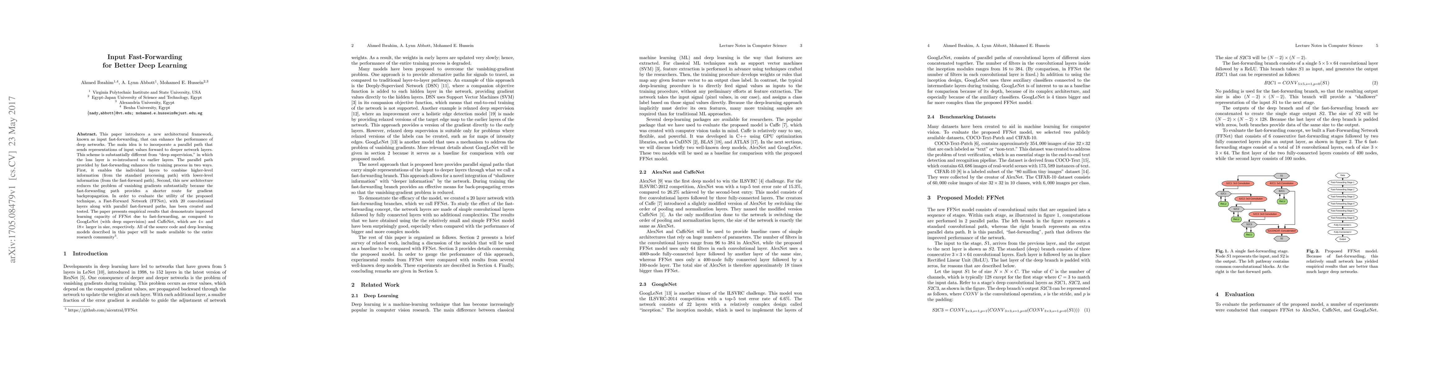 A new deep learning architecture called input fast-forwarding improves performance by sending representations of input values forward to deeper layers, reducing vanishing gradients and enhancing layer combination.