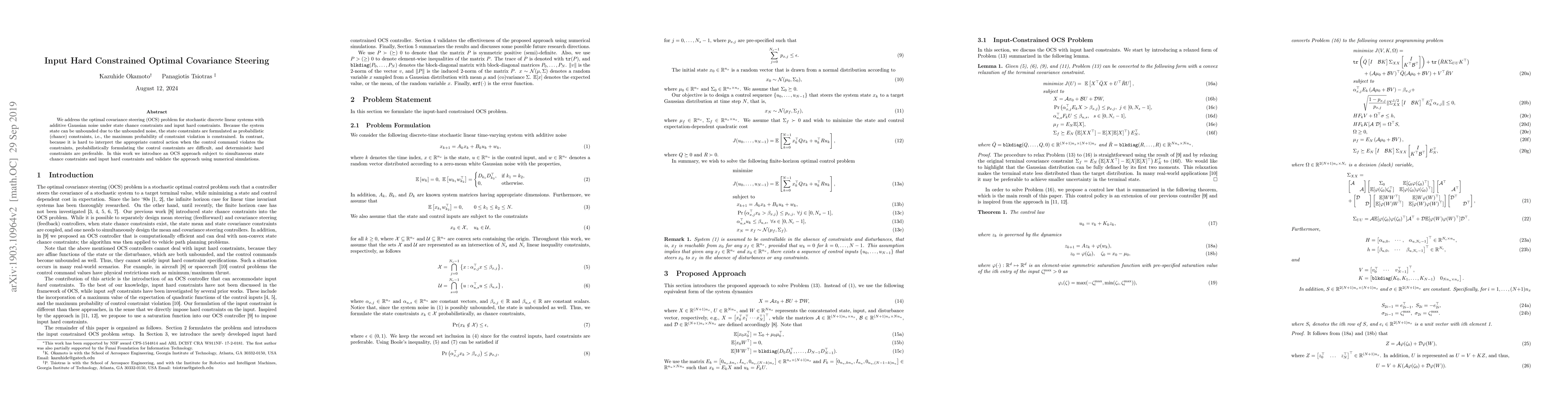 This paper proposes an optimal covariance steering method for stochastic discrete linear systems under state chance constraints and input hard constraints. It addresses the challenge of maintaining system state within probabilistic bounds while enforcing deterministic control limits, validated through numerical simulations.