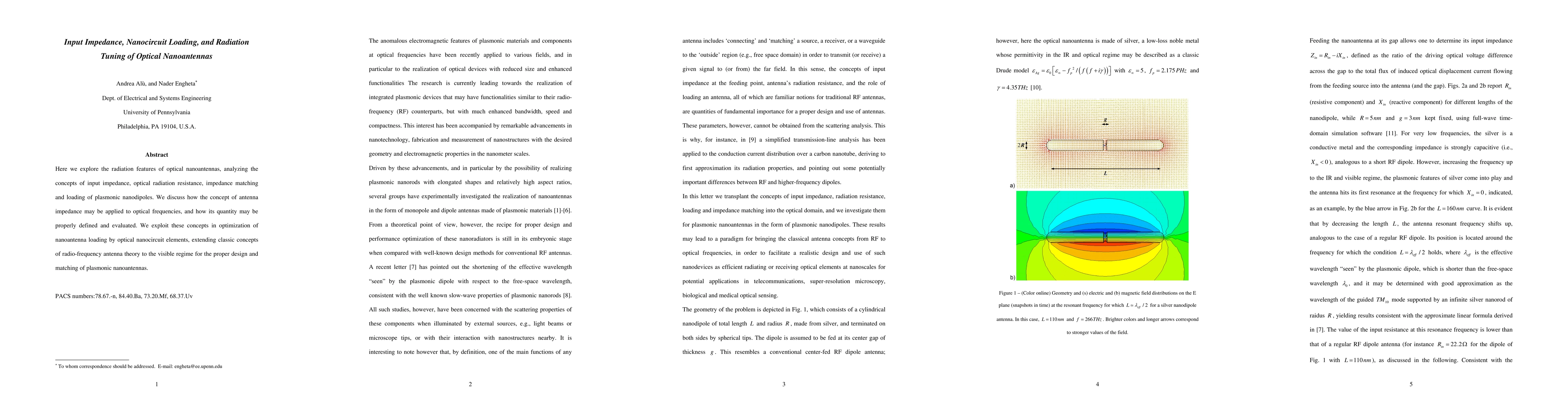 This paper explores how to design and optimize optical nanoantennas using concepts from radio-frequency antenna theory, focusing on input impedance, loading, and radiation tuning for efficient energy transfer.