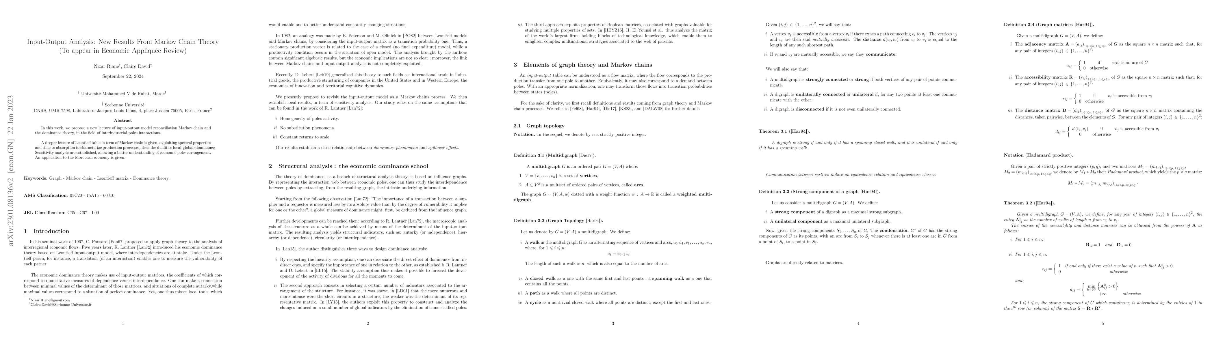 This paper introduces a novel input-output model reconciliation using Markov chain theory to analyze interindustrial interactions, leveraging spectral properties and time to absorption for production processes. It establishes dualities for improved economic analysis and applies these insights to the Moroccan economy.