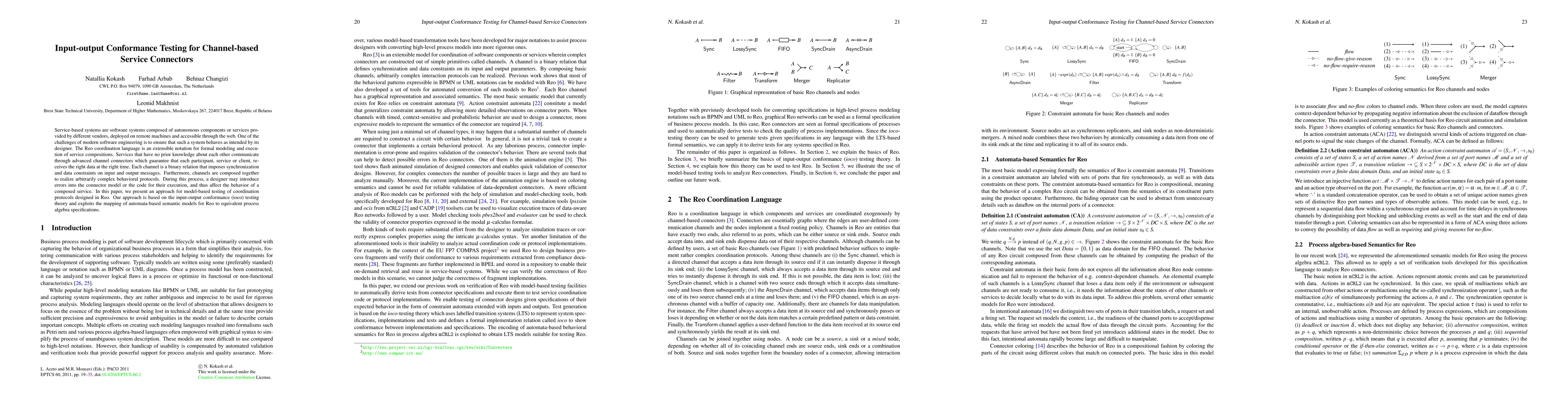 This paper presents a model-based testing approach for coordination protocols in Reo, using input-output conformance (iCo) testing to ensure that service connectors behave as intended by verifying synchronization and data constraints through the composition of channels. The method leverages automata-based semantic models mapped to process algebra specifications for effective testing.