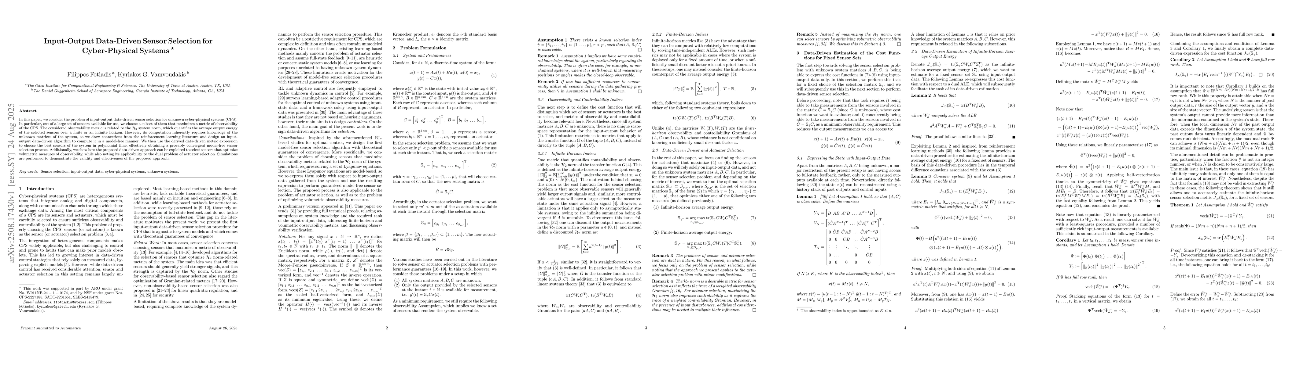 In this paper, we consider the problem of input-output data-driven sensor selection for unknown cyber-physical systems (CPS). In particular, out of a large set of sensors available for use, we choose a subset of them that maximizes a metric of observability of the CPS. The considered observability metric is related to the $\mathcal{H}_2$ system norm, which quantifies the average output energy of the selected sensors over a finite or an infinite horizon. However, its computation inherently requires knowledge of the unknown matrices of the system, so we draw connections from the reinforcement learning literature and design an input-output data-driven algorithm to compute it in a model-free manner. We then use the derived data-driven metric expression to choose the best sensors of the system in polynomial time, effectively obtaining a provably convergent model-free sensor selection process. Additionally, we show how the proposed data-driven approach can be exploited to select sensors that optimize volumetric measures of observability, while also noting its applicability to the dual problem of actuator selection. Simulations are performed to demonstrate the validity and effectiveness of the proposed approach.
