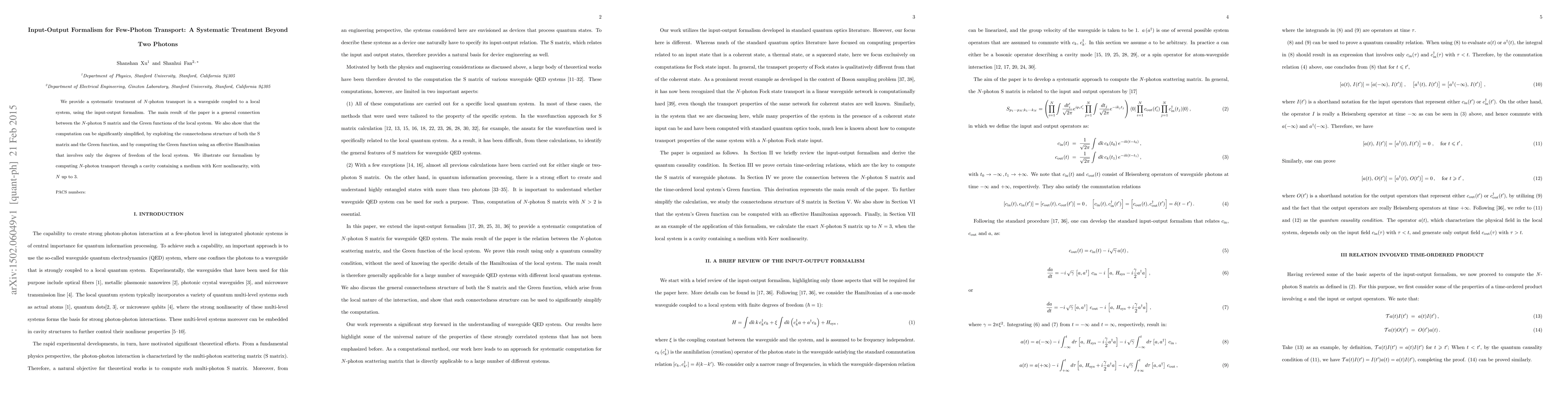 We provide a systematic treatment of $N$-photon transport in a waveguide coupled to a local system, using the input-output formalism. The main result of the paper is a general connection between the $N$-photon S matrix and the Green functions of the local system. We also show that the computation can be significantly simplified, by exploiting the connectedness structure of both the S matrix and the Green function, and by computing the Green function using an effective Hamiltonian that involves only the degrees of freedom of the local system. We illustrate our formalism by computing $N$-photon transport through a cavity containing a medium with Kerr nonlinearity, with $N$ up to 3.