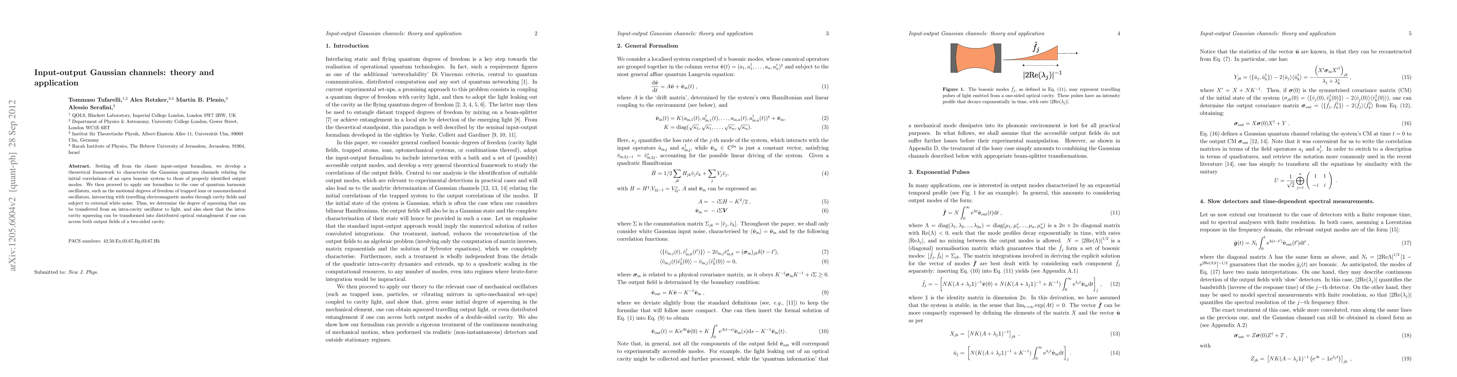 Setting off from the classic input-output formalism, we develop a theoretical framework to characterise the Gaussian quantum channels relating the initial correlations of an open bosonic system to those of properly identified output modes. We then proceed to apply our formalism to the case of quantum harmonic oscillators, such as the motional degrees of freedom of trapped ions or nanomechanical oscillators, interacting with travelling electromagnetic modes through cavity fields and subject to external white noise. Thus, we determine the degree of squeezing that can be transferred from an intra-cavity oscillator to light, and also show that the intra-cavity squeezing can be transformed into distributed optical entanglement if one can access both output fields of a two-sided cavity.