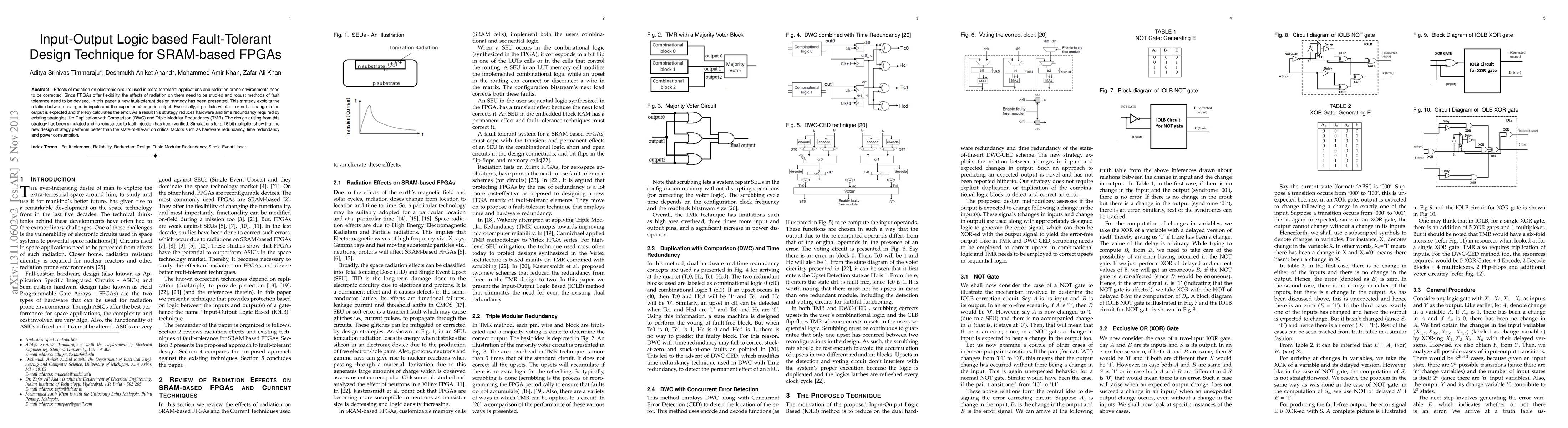 This paper proposes a novel input-output logic based fault-tolerant design technique for SRAM-based FPGAs to mitigate radiation-induced errors. The strategy reduces hardware and time redundancy compared to existing methods, demonstrating superior performance in hardware redundancy, time redundancy, and power consumption through simulations.