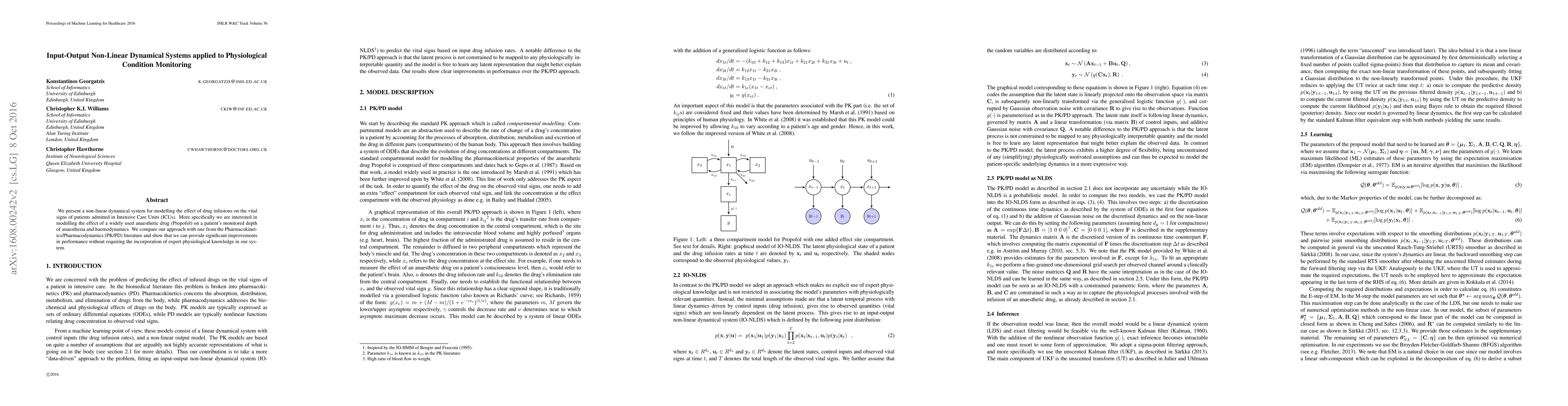 We present a non-linear dynamical system for modelling the effect of drug infusions on the vital signs of patients admitted in Intensive Care Units (ICUs). More specifically we are interested in modelling the effect of a widely used anaesthetic drug (Propofol) on a patient's monitored depth of anaesthesia and haemodynamics. We compare our approach with one from the Pharmacokinetics/Pharmacodynamics (PK/PD) literature and show that we can provide significant improvements in performance without requiring the incorporation of expert physiological knowledge in our system.
