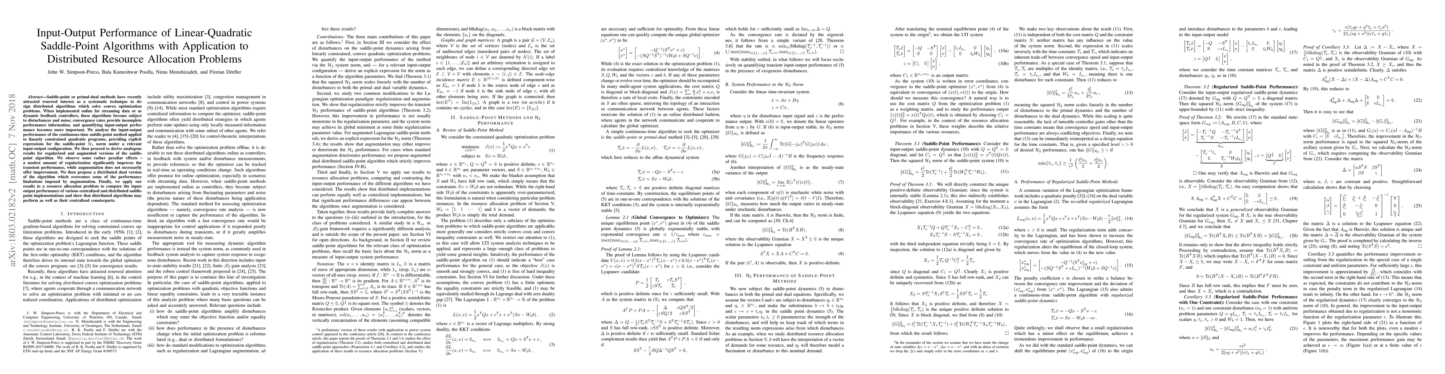 This paper analyzes the input-output performance of linear-quadratic saddle-point algorithms, showing that regularization can enhance transient performance while augmentation does not always help. It proposes a distributed dual version to improve performance and applies the findings to distributed resource allocation, demonstrating comparable performance to centralized methods.