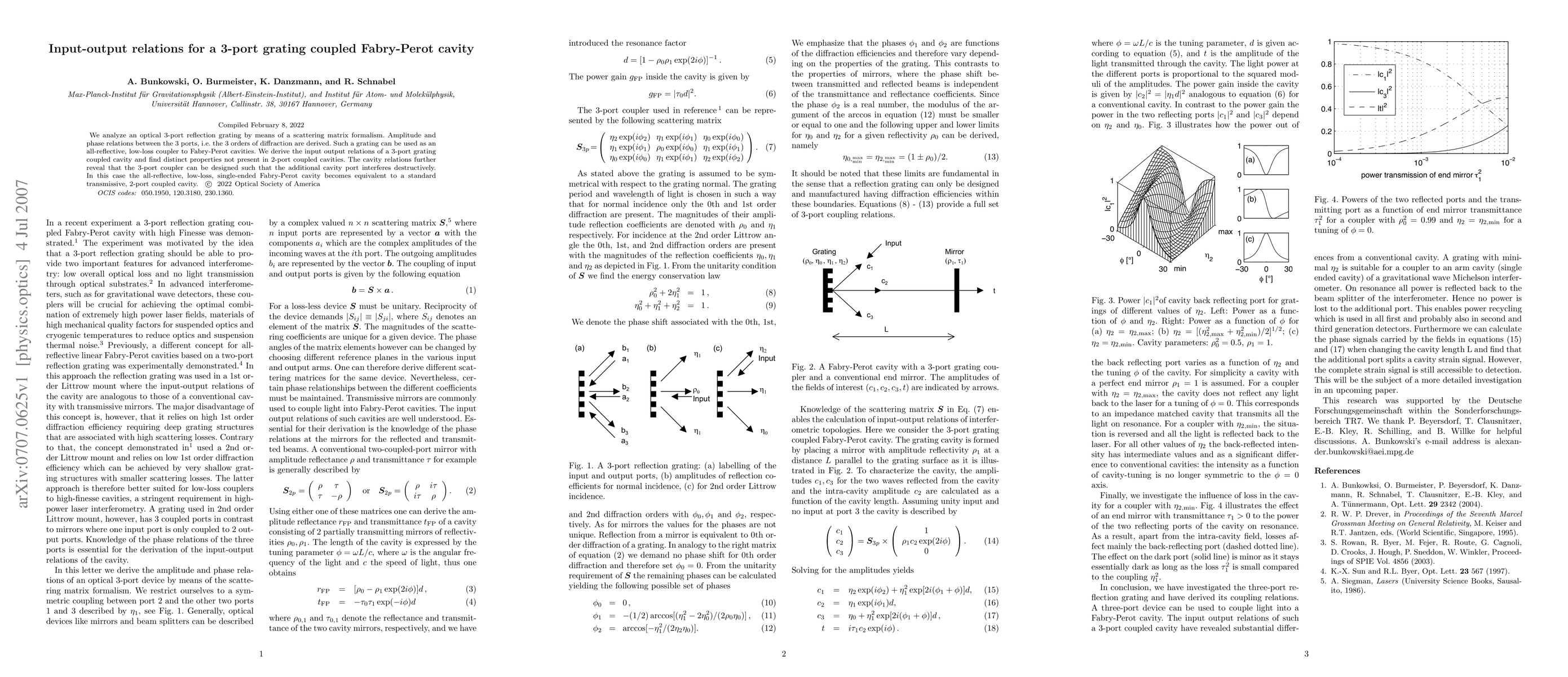 This paper analyzes a 3-port grating coupled Fabry-Perot cavity using scattering matrix formalism, deriving input-output relations and revealing unique properties compared to 2-port counterparts. The 3-port coupler can be designed to make the additional port interfere destructively, effectively mimicking a standard 2-port transmissive cavity.