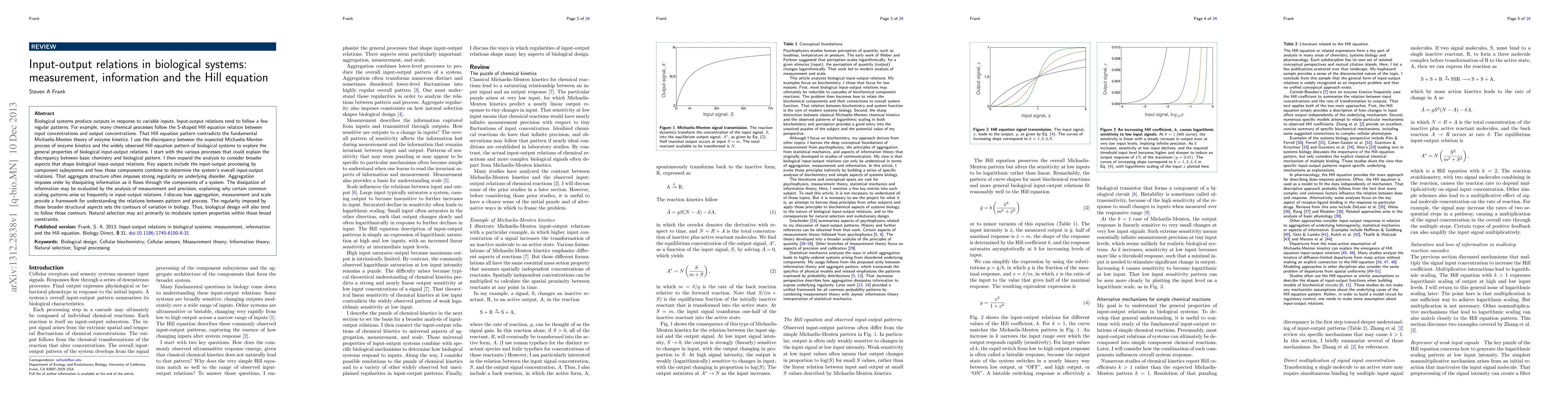 Biological systems produce outputs in response to variable inputs. Input-output relations tend to follow a few regular patterns. For example, many chemical processes follow the S-shaped Hill equation relation between input concentrations and output concentrations. That Hill equation pattern contradicts the fundamental Michaelis-Menten theory of enzyme kinetics. I use the discrepancy between the expected Michaelis-Menten process of enzyme kinetics and the widely observed Hill equation pattern of biological systems to explore the general properties of biological input-output relations. I start with the various processes that could explain the discrepancy between basic chemistry and biological pattern. I then expand the analysis to consider broader aspects that shape biological input-output relations. Key aspects include the input-output processing by component subsystems and how those components combine to determine the system's overall input-output relations. That aggregate structure often imposes strong regularity on underlying disorder. Aggregation imposes order by dissipating information as it flows through the components of a system. The dissipation of information may be evaluated by the analysis of measurement and precision, explaining why certain common scaling patterns arise so frequently in input-output relations. I discuss how aggregation, measurement and scale provide a framework for understanding the relations between pattern and process. The regularity imposed by those broader structural aspects sets the contours of variation in biology. Thus, biological design will also tend to follow those contours. Natural selection may act primarily to modulate system properties within those broad constraints.