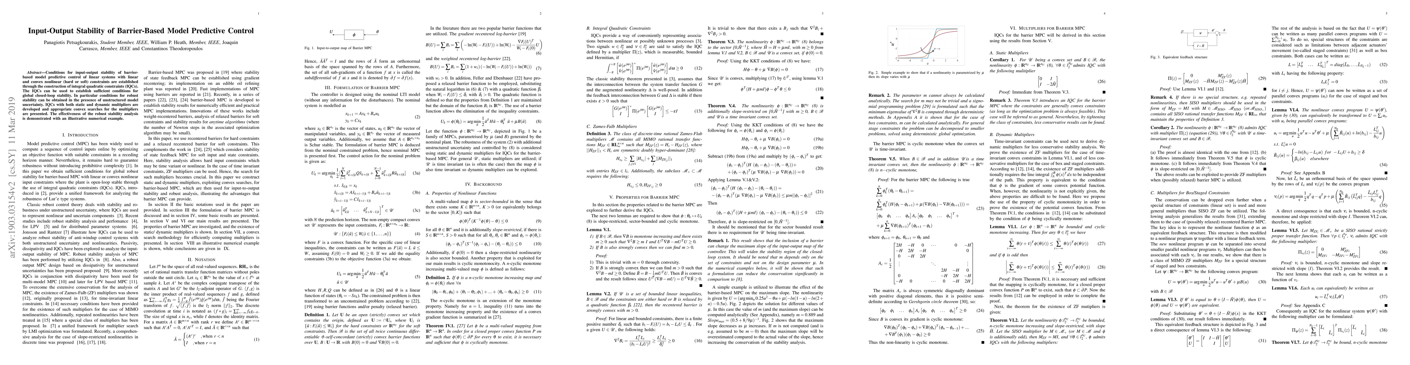 This research paper presents conditions for input-output stability of barrier-based model predictive control in linear systems with linear and convex nonlinear constraints. It uses integral quadratic constraints (IQCs) to establish sufficient conditions for global closed-loop stability, even with unstructured model uncertainty. The methodology includes developing IQCs with both static and dynamic multipliers, and demonstrating their effectiveness through a numerical example.