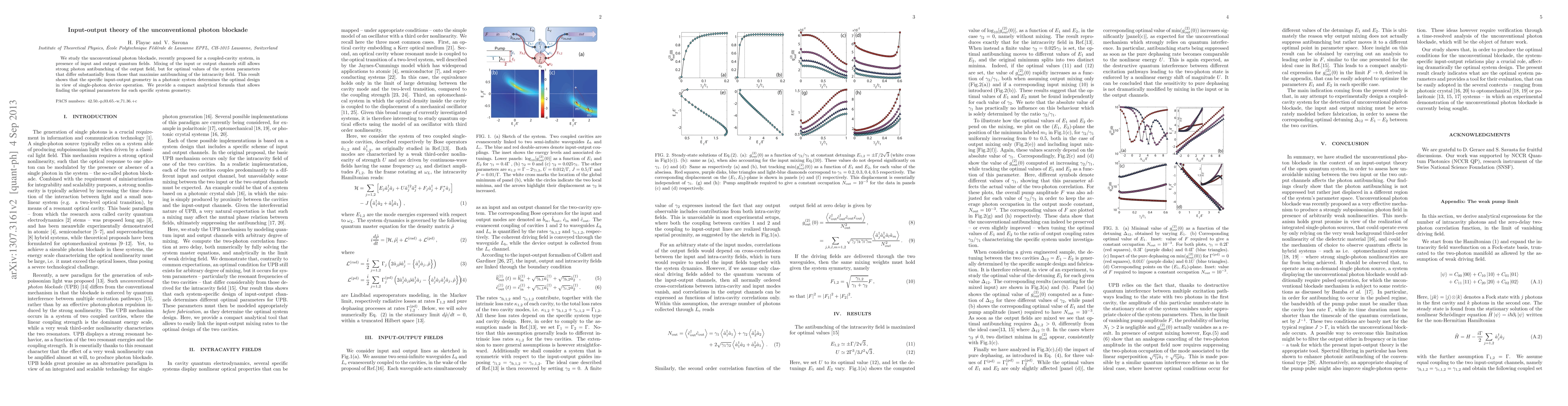 The paper investigates the unconventional photon blockade in coupled-cavity systems under input-output quantum fields, revealing that optimal antibunching conditions differ from those maximizing intracavity antibunching. It provides an analytical formula for determining optimal parameters based on the specific system geometry.