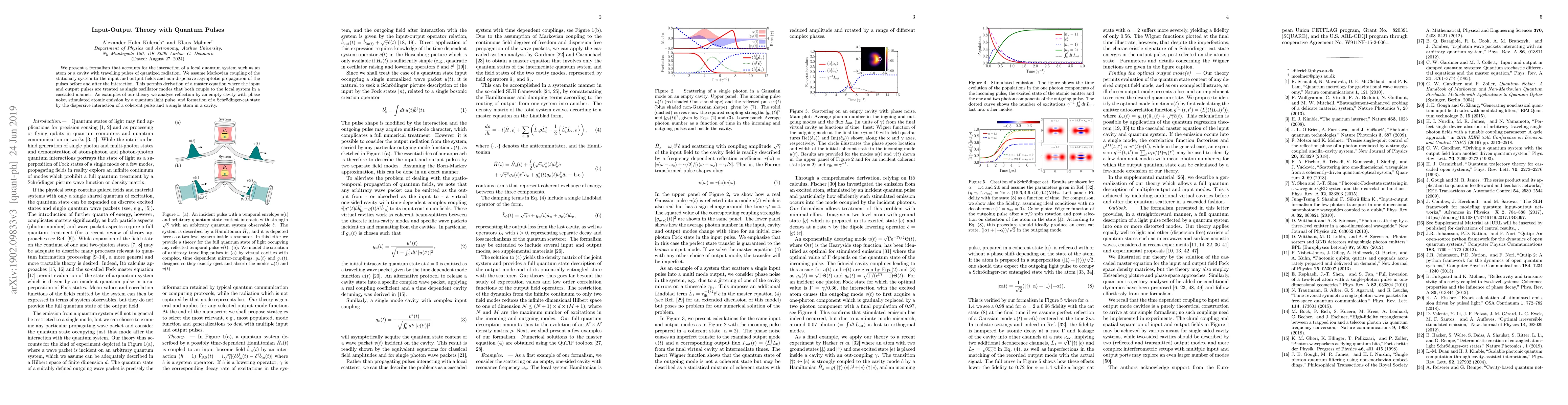 This paper develops a formalism for the evolution of quantum states of light pulses interacting with local quantum scatterers, deriving a cascaded system master equation for input and output pulses. It applies the theory to phenomena like reflection by an empty cavity, stimulated atomic emission, and the formation of Schrödinger-cat states.