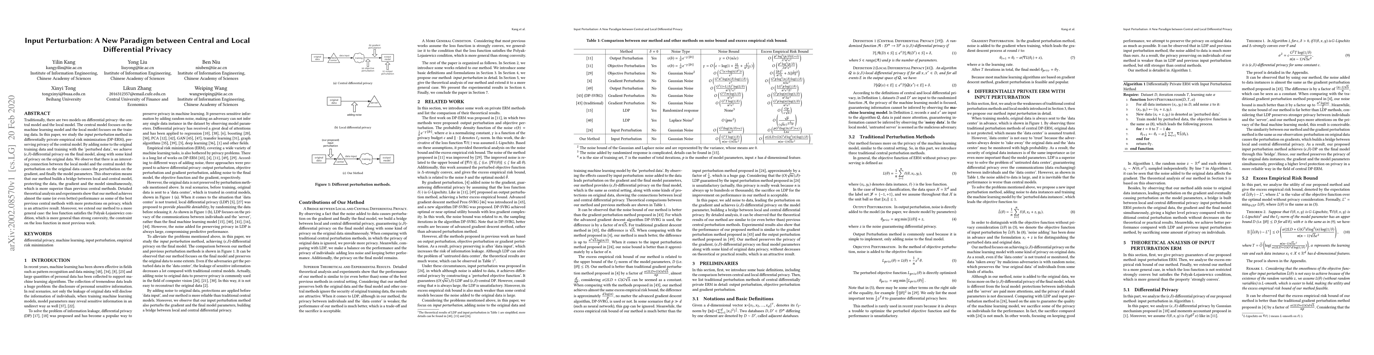 Traditionally, there are two models on differential privacy: the central model and the local model. The central model focuses on the machine learning model and the local model focuses on the training data. In this paper, we study the \textit{input perturbation} method in differentially private empirical risk minimization (DP-ERM), preserving privacy of the central model. By adding noise to the original training data and training with the `perturbed data', we achieve ($\epsilon$,$\delta$)-differential privacy on the final model, along with some kind of privacy on the original data. We observe that there is an interesting connection between the local model and the central model: the perturbation on the original data causes the perturbation on the gradient, and finally the model parameters. This observation means that our method builds a bridge between local and central model, protecting the data, the gradient and the model simultaneously, which is more superior than previous central methods. Detailed theoretical analysis and experiments show that our method achieves almost the same (or even better) performance as some of the best previous central methods with more protections on privacy, which is an attractive result. Moreover, we extend our method to a more general case: the loss function satisfies the Polyak-Lojasiewicz condition, which is more general than strong convexity, the constraint on the loss function in most previous work.