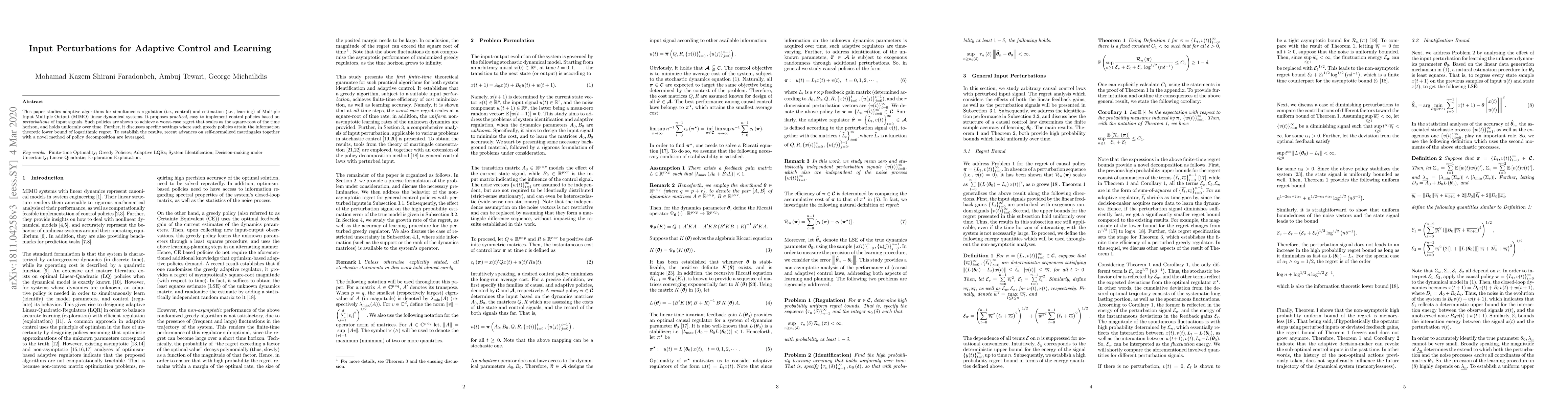 This paper studies adaptive algorithms for simultaneous regulation (i.e., control) and estimation (i.e., learning) of Multiple Input Multiple Output (MIMO) linear dynamical systems. It proposes practical, easy to implement control policies based on perturbations of input signals. Such policies are shown to achieve a worst-case regret that scales as the square-root of the time horizon, and holds uniformly over time. Further, it discusses specific settings where such greedy policies attain the information theoretic lower bound of logarithmic regret. To establish the results, recent advances on self-normalized martingales together with a novel method of policy decomposition are leveraged.