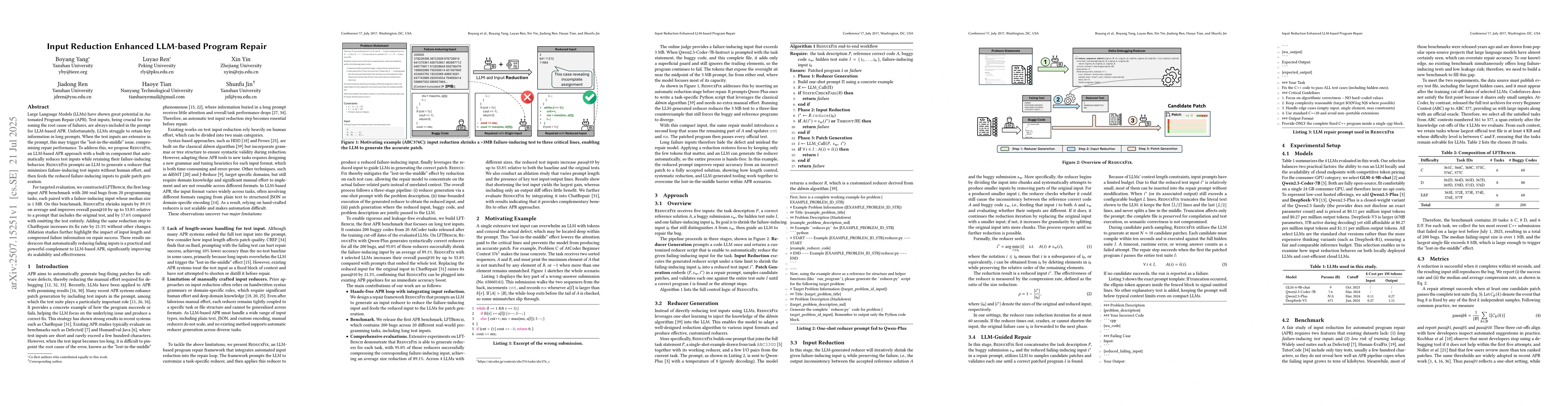 The research introduces ReduceFix, an LLM-based Automated Program Repair method that automatically reduces lengthy test inputs while preserving their failure-causing properties. Evaluate on LFTBench, a new benchmark with 200 real bugs, ReduceFix reduces input size by 89.1% on average and boosts repair success by up to 53.8%, demonstrating the effectiveness of input reduction for enhancing LLM-based APR.