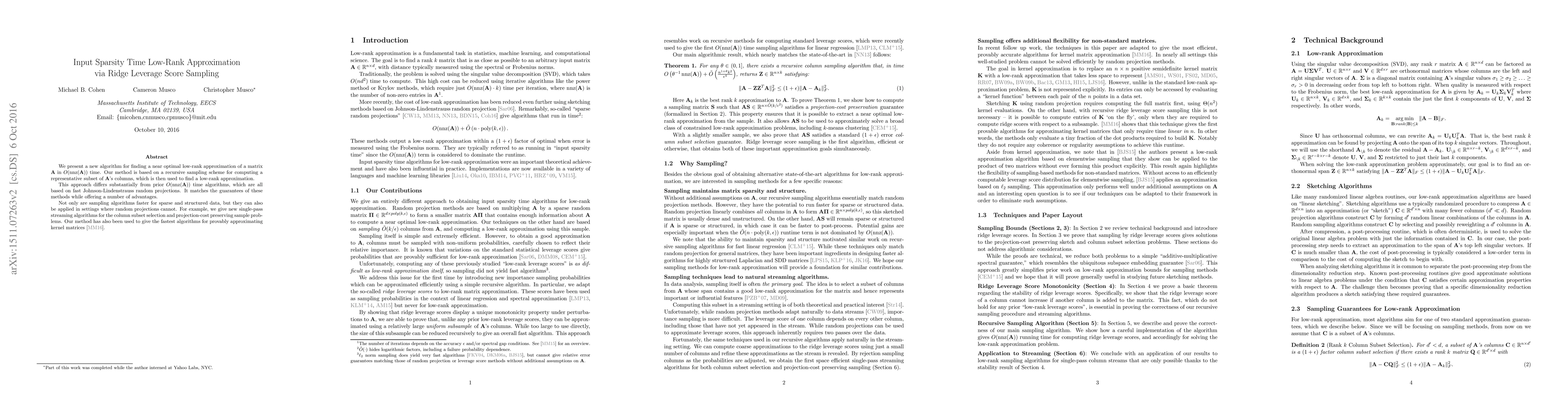 This paper introduces a novel algorithm for achieving near-optimal low-rank approximations of a matrix in $O(nnz(A))$ time using a recursive sampling scheme, offering advantages over existing methods based on random projections, especially for sparse and structured data. The approach enables faster computations and new single-pass streaming algorithms.