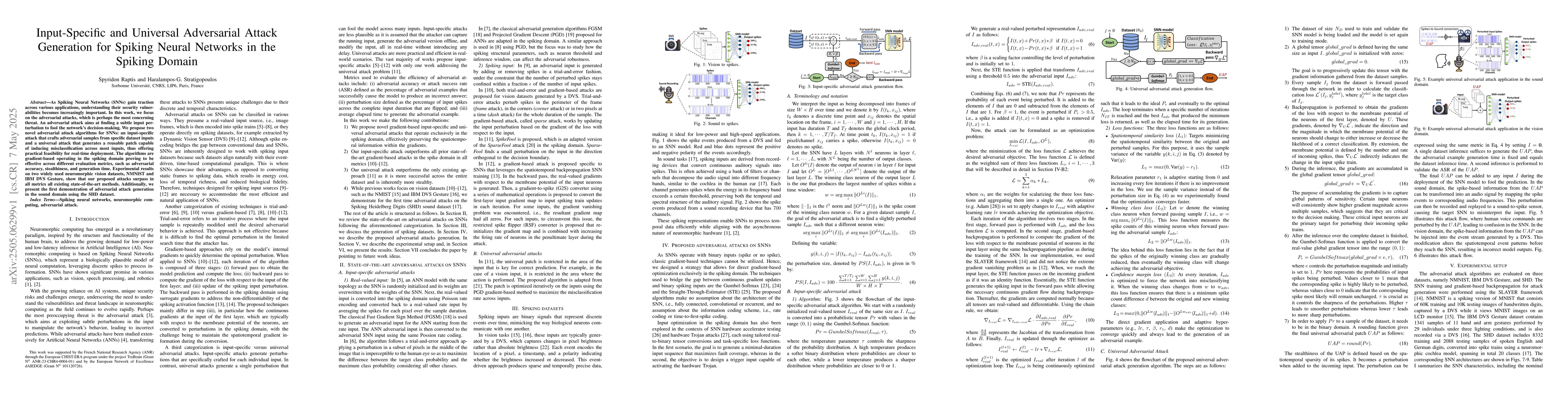 The work introduces input-specific and universal adversarial attacks tailored for SNNs, extending adversarial research to the spiking domain and demonstrating its effectiveness on both visual and auditory datasets.