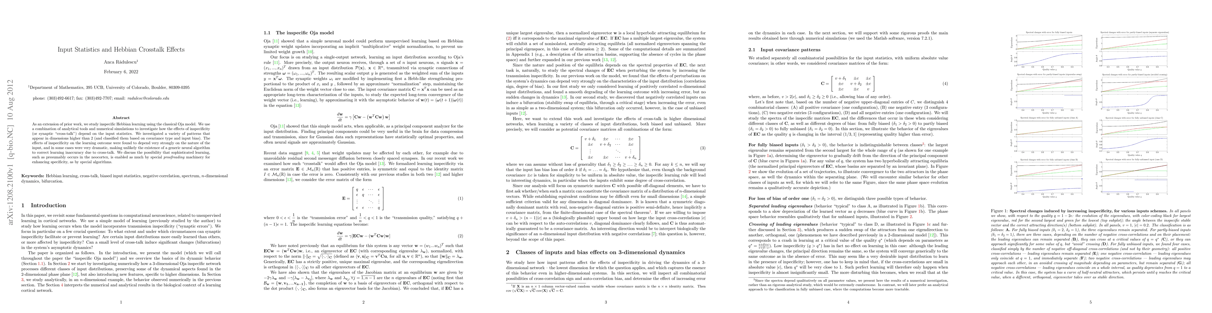 As an extension of prior work, we study inspecific Hebbian learning using the classical Oja model. We use a combination of analytical tools and numerical simulations to investigate how the effects of inspecificity (or synaptic "cross-talk") depend on the input statistics. We investigated a variety of patterns that appear in dimensions higher than 2 (and classified them based on covariance type and input bias). The effects of inspecificity on the learning outcome were found to depend very strongly on the nature of the input, and in some cases were very dramatic, making unlikely the existence of a generic neural algorithm to correct learning inaccuracy due to cross-talk. We discuss the possibility that sophisticated learning, such as presumably occurs in the neocortex, is enabled as much by special proofreading machinery for enhancing specificity, as by special algorithms.