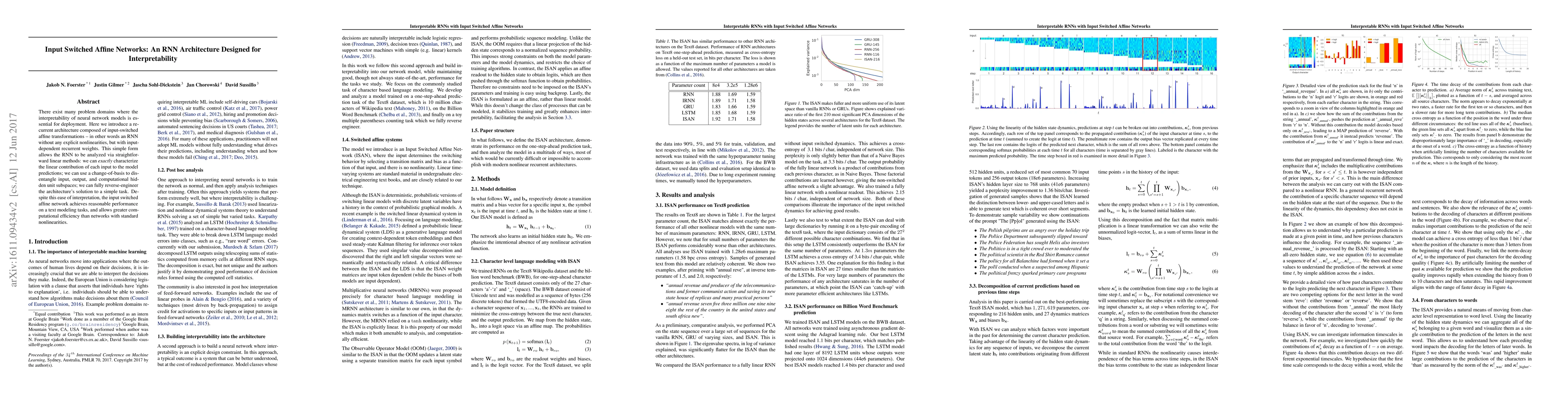 There exist many problem domains where the interpretability of neural network models is essential for deployment. Here we introduce a recurrent architecture composed of input-switched affine transformations - in other words an RNN without any explicit nonlinearities, but with input-dependent recurrent weights. This simple form allows the RNN to be analyzed via straightforward linear methods: we can exactly characterize the linear contribution of each input to the model predictions; we can use a change-of-basis to disentangle input, output, and computational hidden unit subspaces; we can fully reverse-engineer the architecture's solution to a simple task. Despite this ease of interpretation, the input switched affine network achieves reasonable performance on a text modeling tasks, and allows greater computational efficiency than networks with standard nonlinearities.
