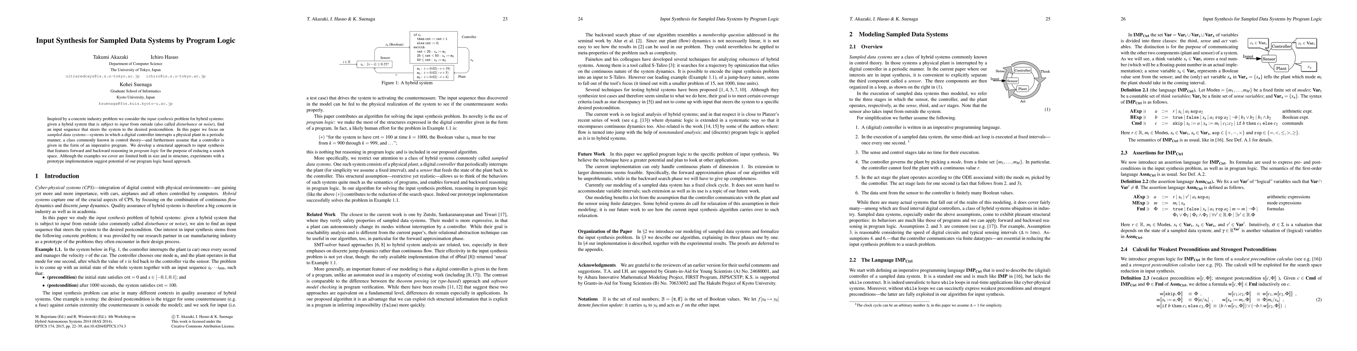 This paper addresses the input synthesis problem for sampled data systems, focusing on hybrid systems subject to external disturbances. It proposes a structural approach using forward and backward reasoning in program logic to reduce the search space, demonstrating potential through a prototype implementation.