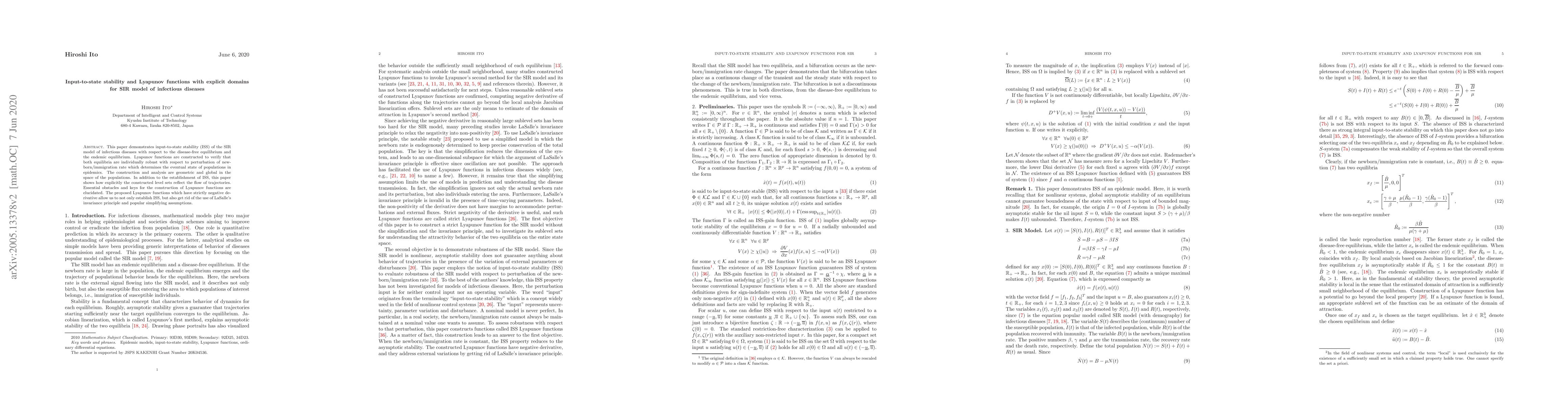 This paper establishes input-to-state stability (ISS) for the SIR model of infectious diseases using constructed Lyapunov functions, demonstrating robustness against perturbations in the newborn/immigration rate. The proposed Lyapunov functions provide explicit level sets that reflect trajectory dynamics, eliminating the need for LaSalle's invariance principle and simplifying assumptions.