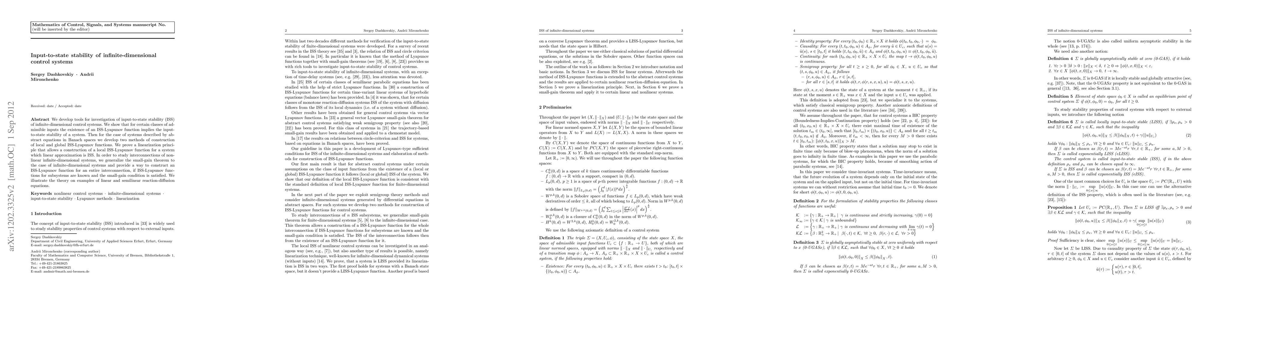 This paper develops methods for assessing input-to-state stability (ISS) in infinite-dimensional control systems, proving that the existence of an ISS-Lyapunov function guarantees ISS. It introduces techniques for constructing local and global ISS-Lyapunov functions and extends the small-gain theorem to infinite-dimensional systems, providing a framework for analyzing interconnected nonlinear systems.