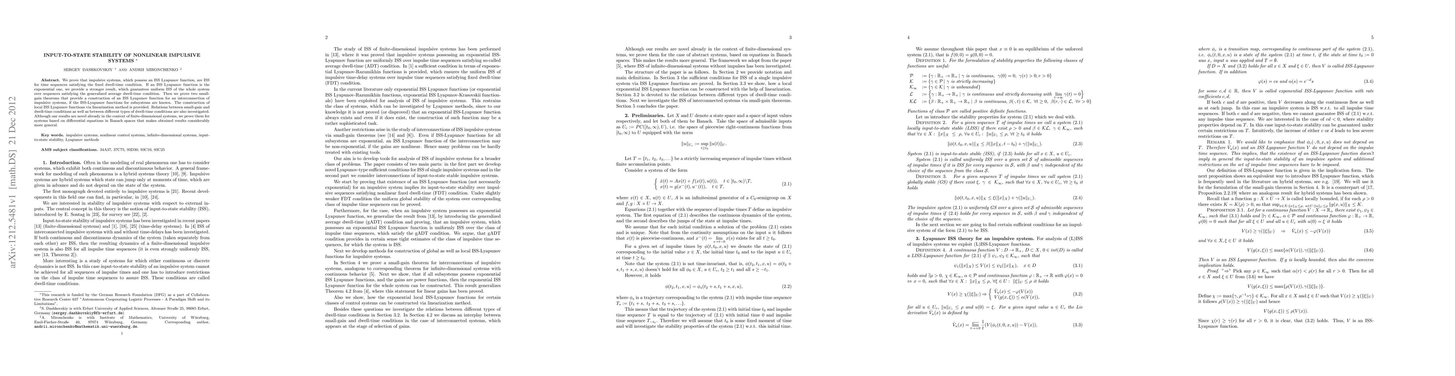 This paper proves the input-to-state stability (ISS) of nonlinear impulsive systems under dwell-time conditions, providing stronger results for exponential ISS Lyapunov functions. It also constructs ISS Lyapunov functions for interconnected impulsive systems and explores relationships between small-gain and dwell-time conditions, extending findings to systems in Banach spaces.