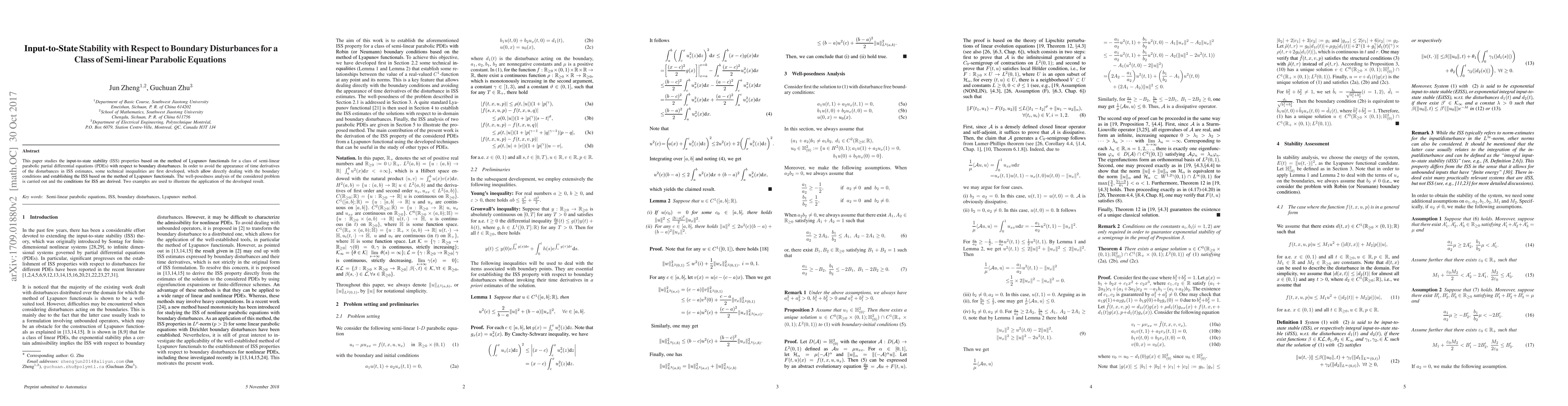 This paper investigates input-to-state stability (ISS) for semi-linear parabolic PDEs under boundary disturbances using Lyapunov functionals, developing technical inequalities to avoid time derivatives in ISS estimates. The conditions for ISS are derived, and examples demonstrate the method's application.