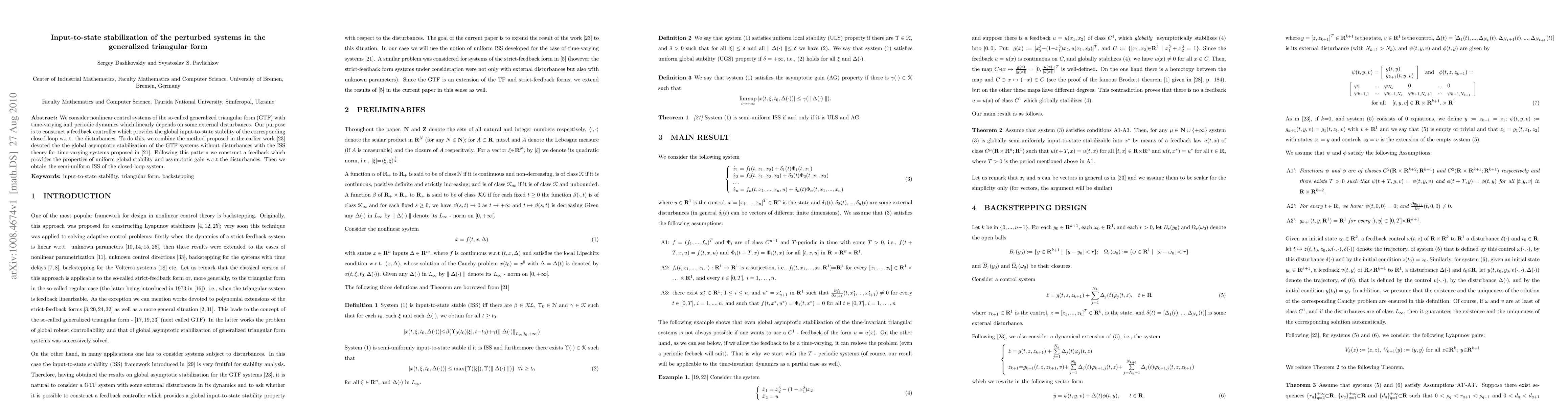 This paper develops a feedback controller for nonlinear systems in generalized triangular form that ensures global input-to-state stability against external disturbances. It combines prior stabilization methods with input-to-state stability (ISS) theory to achieve uniform global stability and asymptotic gain.