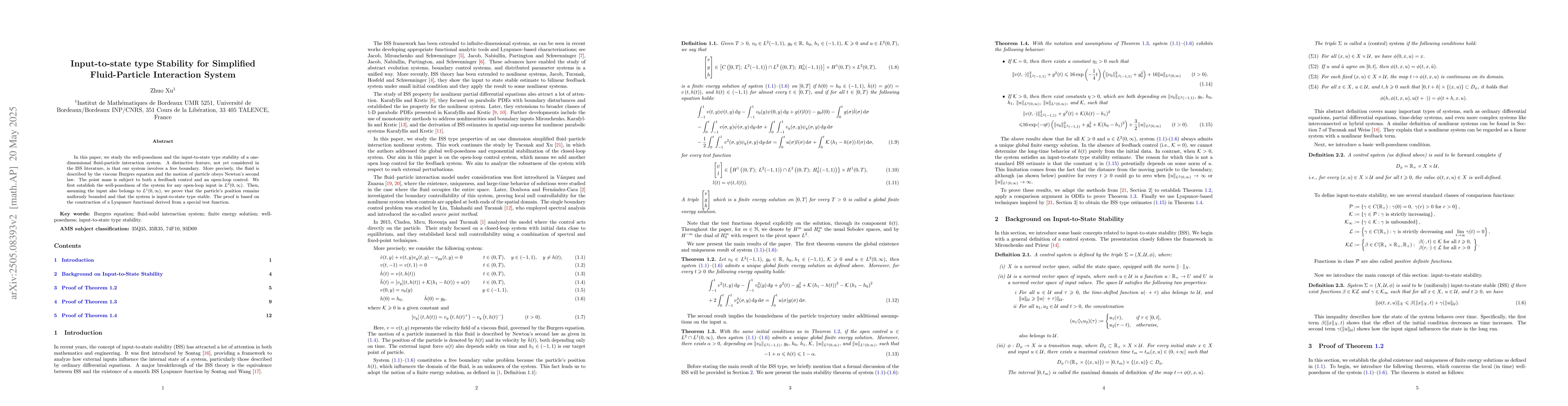The research establishes well-posedness and input-to-state stability of a one-dimensional fluid-particle interaction system described by the viscous Burgers equation for fluid motion and Newton's second law for particle motion, considering both feedback and open-loop controls.