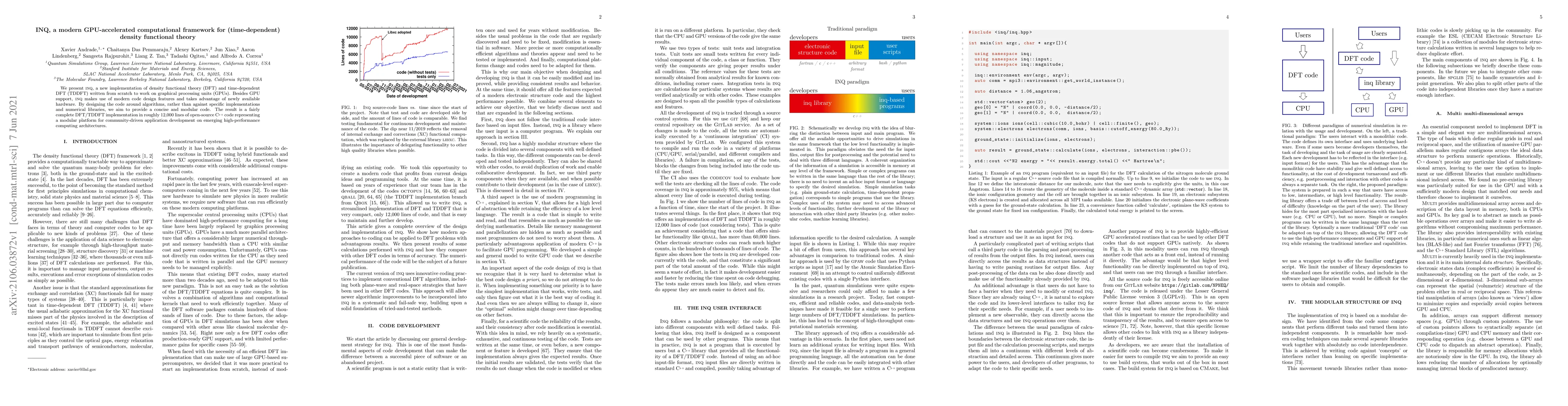 We present INQ, a new implementation of density functional theory (DFT) and time-dependent DFT (TDDFT) written from scratch to work on graphical processing units (GPUs). Besides GPU support, INQ makes use of modern code design features and takes advantage of newly available hardware. By designing the code around algorithms, rather than against specific implementations and numerical libraries, we aim to provide a concise and modular code. The result is a fairly complete DFT/TDDFT implementation in roughly 12,000 lines of open-source C++ code representing a modular platform for community-driven application development on emerging high-performance computing architectures for the simulation of materials.