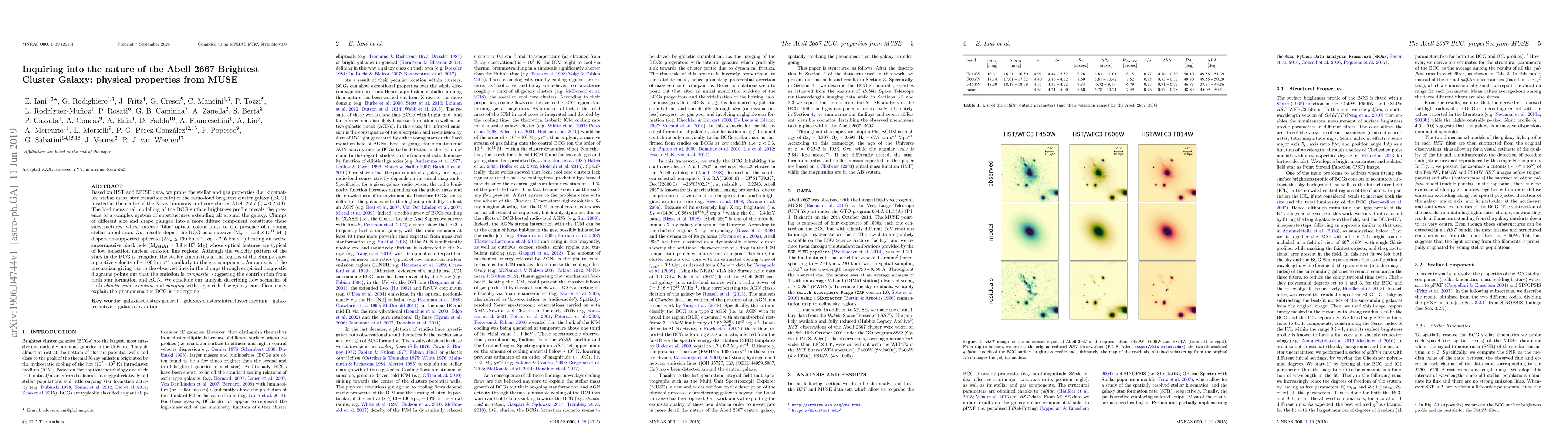 Based on HST and MUSE data, we probe the stellar and gas properties (i.e. kinematics, stellar mass, star formation rate) of the radio-loud brightest cluster galaxy (BCG) located at the centre of the X-ray luminous cool core cluster Abell 2667 (z = 0.2343). The bi-dimensional modelling of the BCG surface brightness profile reveals the presence of a complex system of substructures extending all around the galaxy. Clumps of different size and shape plunged into a more diffuse component constitute these substructures, whose intense 'blue' optical colour hints to the presence of a young stellar population. Our results depict the BCG as a massive (M_star ~ 1.38 x 10^11 M_sun) dispersion-supported spheroid (v_star < 150 km/s, sigma_0 ~ 216 km/s) hosting an active supermassive black hole (M_SMBH ~ 3.8 x 10^9 M_sun) whose optical features are typical of low ionisation nuclear emission line regions. Although the velocity pattern of the stars in the BCG is irregular, the stellar kinematics in the regions of the clumps show a positive velocity of ~ 100 km/s, similarly to the gas component. An analysis of the mechanism giving rise to the observed lines in the clumps through empirical diagnostic diagrams points out that the emission is composite, suggesting the contribution from both star formation and AGN. We conclude our analysis describing how scenarios of both chaotic cold accretion and merging with a gas-rich disc galaxy can efficaciously explain the phenomena the BCG is undergoing.