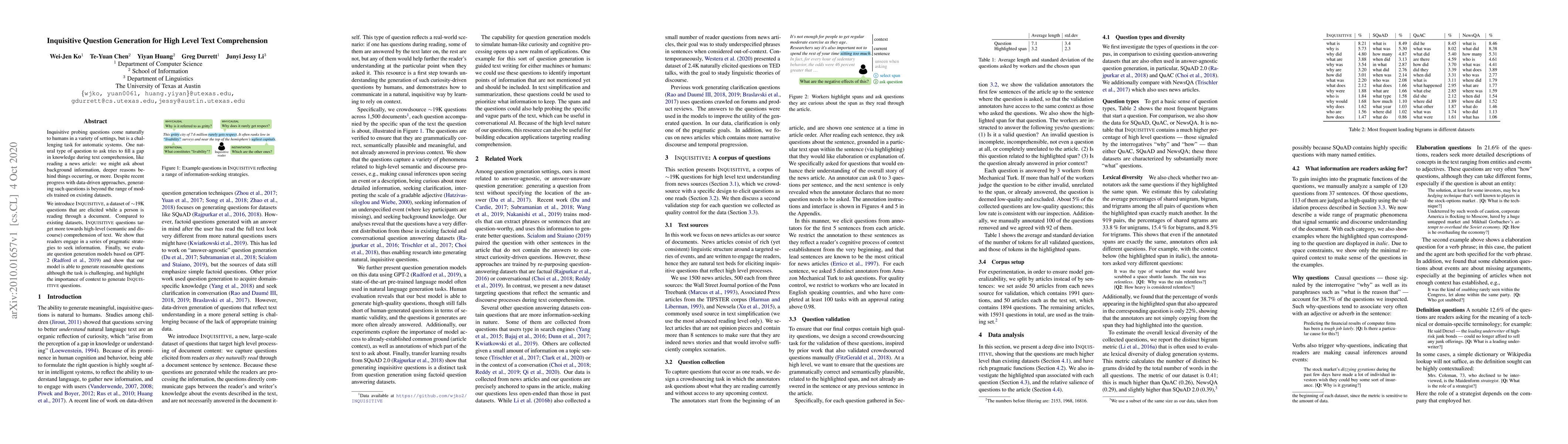 This paper introduces INQUISITIVE, a dataset of ~19K questions elicited from readers to enhance high-level text comprehension, and evaluates GPT-2 models for generating such questions, highlighting the importance of context and the challenges involved.
