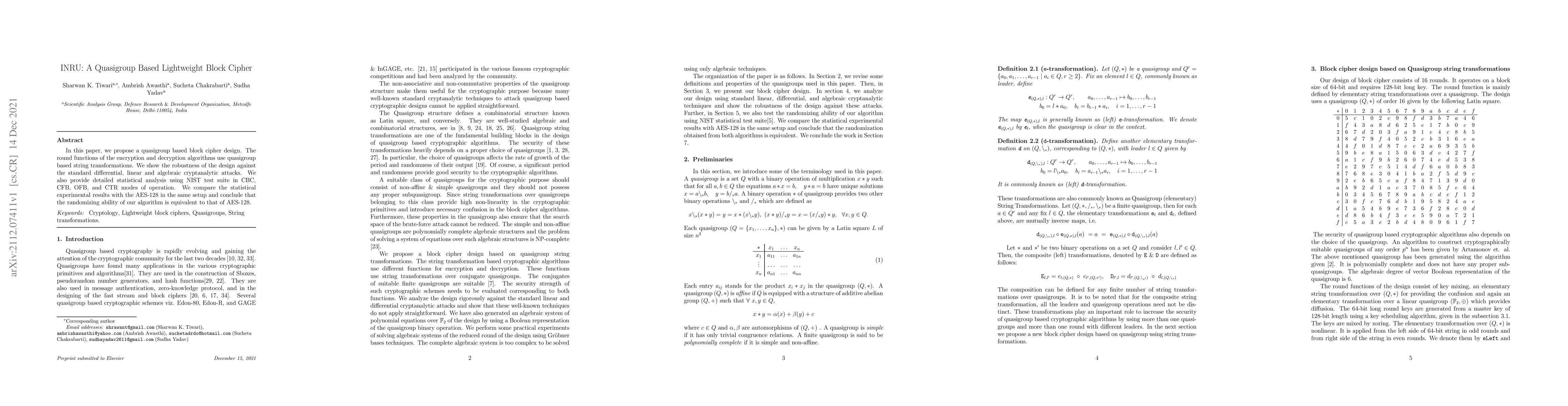 This paper introduces INRU, a lightweight block cipher based on quasigroup theory, demonstrating its robustness against standard cryptanalytic attacks and comparing its statistical randomness to AES-128 using the NIST test suite across various operational modes.