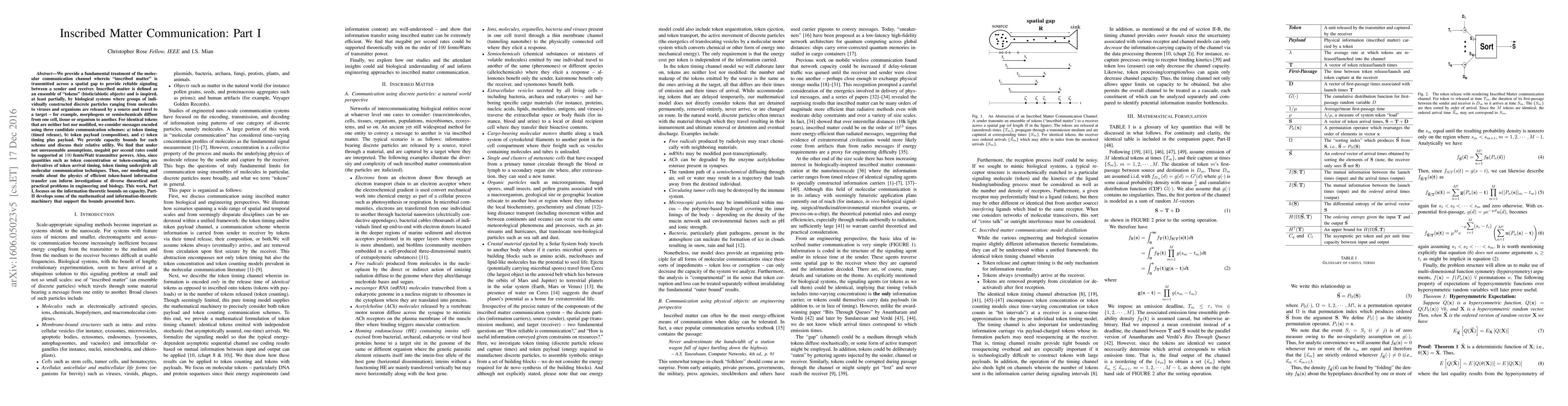 This paper explores the molecular communication channel where "inscribed matter" (molecules or objects) is transmitted across a spatial gap for reliable signaling. It examines three communication schemes based on token timing, payload, and their combination, providing capacity bounds and demonstrating that efficient information transfer can occur at very low power levels. Part I focuses on information theoretic capacity bounds, while Part II delves into the mathematical underpinnings.