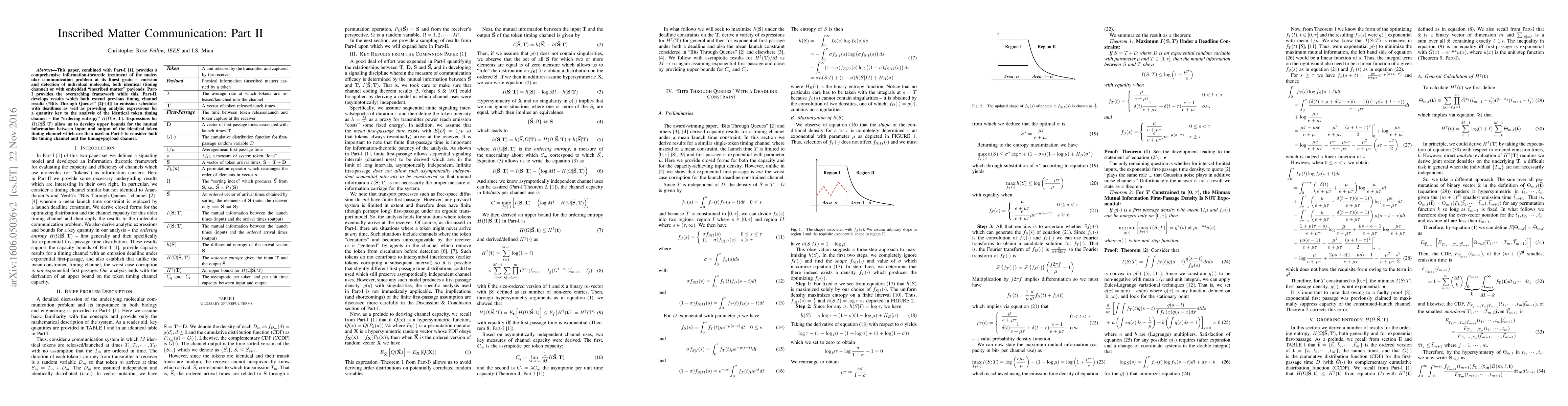 This paper is Part II of a two-paper set which develops a finest-grain per-molecule timing treatment of molecular communication. We first consider a simple one-molecule timing channel with a molecule launch deadline, similar to but different from previous work ("Bits Through Queues") where the constraint was mean launch time. We also derive a number of results related to the {\em ordering entropy}, a key quantity which undergirds the capacity bounds for the molecular timing channel, both with and without token data payloads. We then conclude with an upper bound on molecular timing-channel capacity.