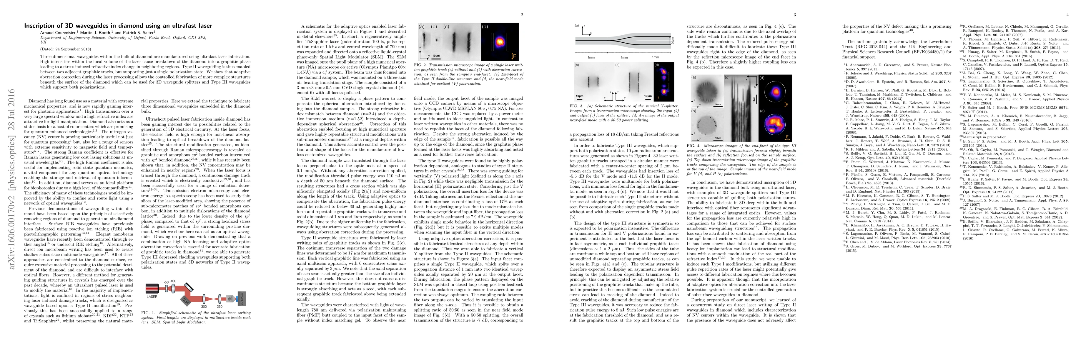 This paper details the creation of 3D waveguides in diamond using ultrafast laser fabrication, resulting in graphitic tracks that enable Type II single-polarization guiding. Adaptive aberration correction during laser processing allows for the fabrication of complex structures, including 3D waveguide splitters and Type III waveguides that support both polarization states.