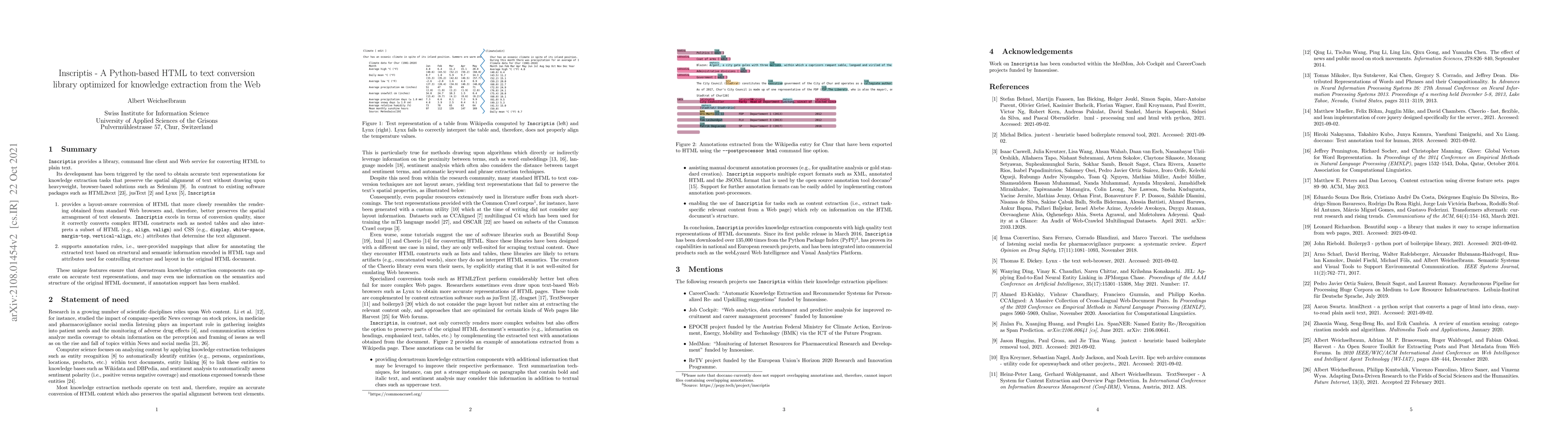 Inscriptis is a Python-based library for converting HTML to plain text, offering layout-aware conversion that mirrors standard browser rendering and supports annotation rules for preserving structural and semantic HTML information for knowledge extraction tasks.