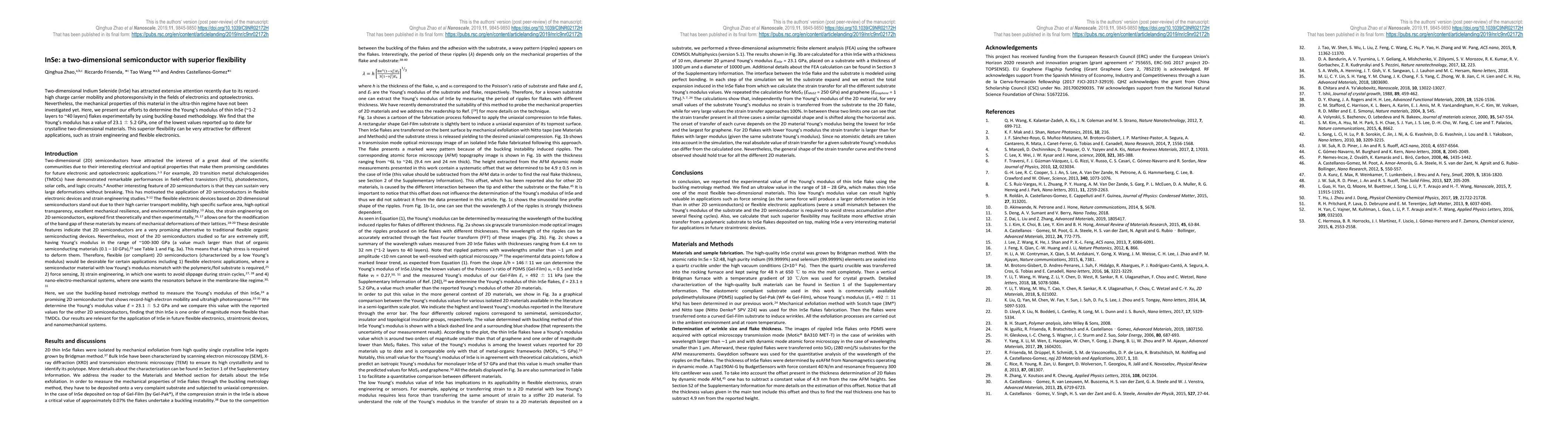 InSe, a two-dimensional semiconductor, exhibits exceptional flexibility with a Young's modulus of 23.1 ± 5.2 GPa, one of the lowest for crystalline 2D materials, making it promising for applications in strain engineering and flexible electronics.