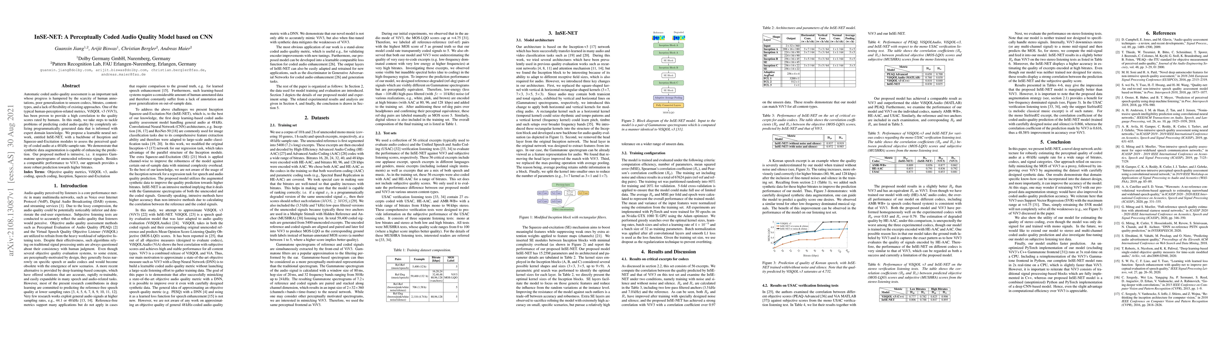 This research introduces InSE-NET, a neural network model leveraging CNN with Inception and Squeeze-and-Excitation modules for assessing the perceptual quality of coded audio. The study aims to address challenges in automatic audio quality assessment, demonstrating enhanced prediction robustness, especially at higher bitrates, through synthetic data augmentation.