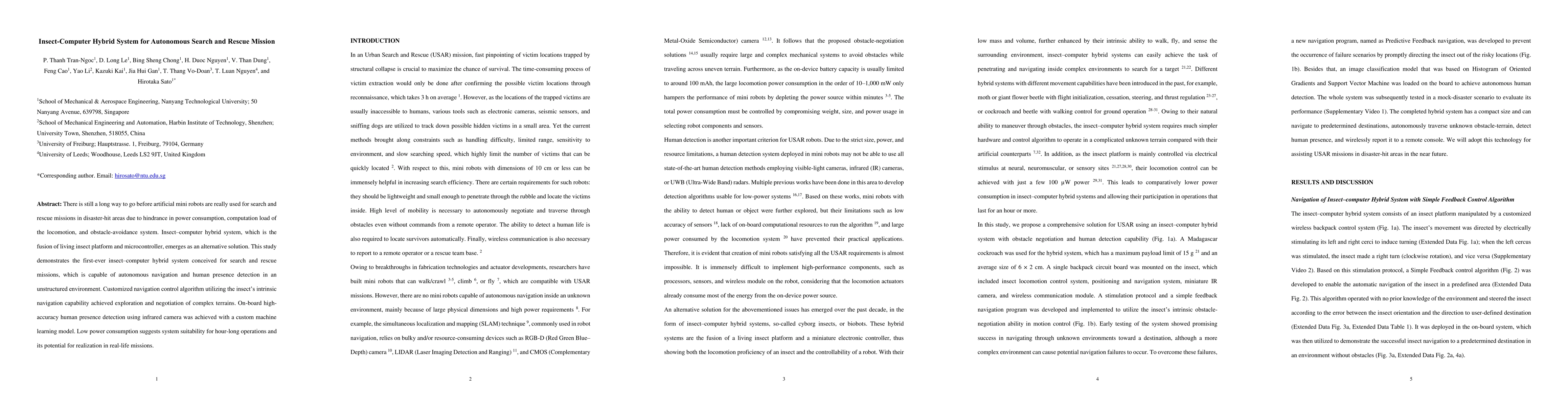 This study presents an innovative insect-computer hybrid system for autonomous search and rescue missions, combining living insect navigation with microcontroller control for low power, efficient obstacle avoidance, and high-accuracy human presence detection. The hybrid system demonstrates long-duration operation potential in complex environments.