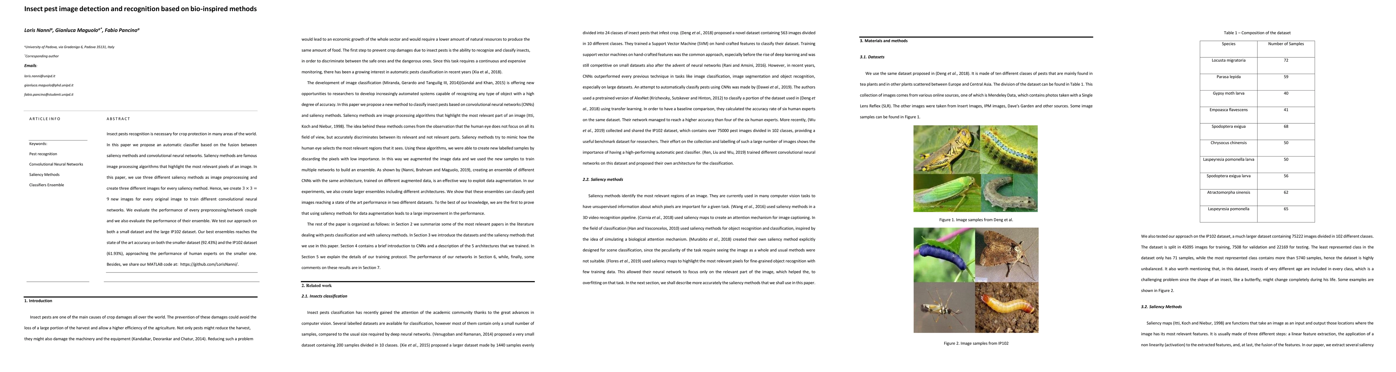 This paper proposes an automatic classifier for insect pest detection using a fusion of saliency methods and convolutional neural networks, achieving state-of-the-art accuracy on both small and large datasets. The authors share their MATLAB code for reproducibility.