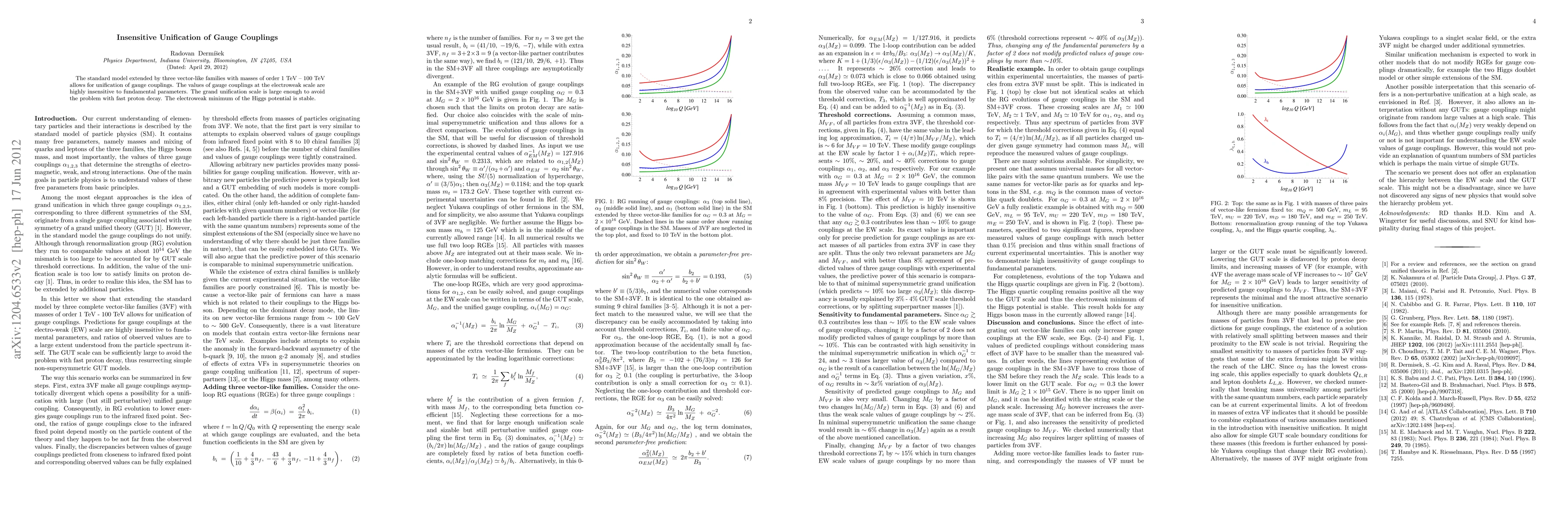 This paper proposes an extended standard model with three vector-like families, achieving unification of gauge couplings at a high scale while remaining insensitive to electroweak scale parameters. It avoids fast proton decay and maintains a stable Higgs potential.